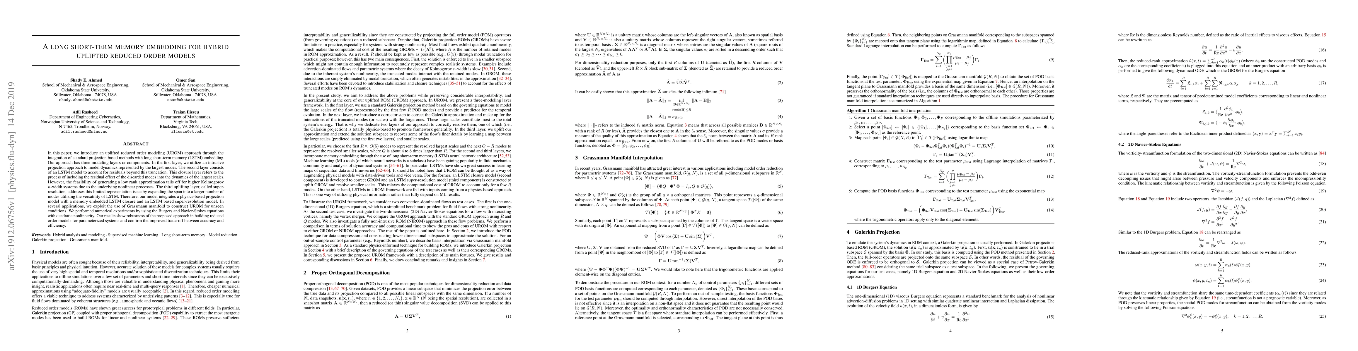 In this paper, we introduce an uplifted reduced order modeling (UROM) approach through the integration of standard projection based methods with long short-term memory (LSTM) embedding. Our approach has three modeling layers or components. In the first layer, we utilize an intrusive projection approach to model dynamics represented by the largest modes. The second layer consists of an LSTM model to account for residuals beyond this truncation. This closure layer refers to the process of including the residual effect of the discarded modes into the dynamics of the largest scales. However, the feasibility of generating a low rank approximation tails off for higher Kolmogorov $n$-width systems due to the underlying nonlinear processes. The third uplifting layer, called super-resolution, addresses this limited representation issue by expanding the span into a larger number of modes utilizing the versatility of LSTM. Therefore, our model integrates a physics-based projection model with a memory embedded LSTM closure and an LSTM based super-resolution model. In several applications, we exploit the use of Grassmann manifold to construct UROM for unseen conditions. We performed numerical experiments by using the Burgers and Navier-Stokes equations with quadratic nonlinearity. Our results show robustness of the proposed approach in building reduced order models for parameterized systems and confirm the improved trade-off between accuracy and efficiency.