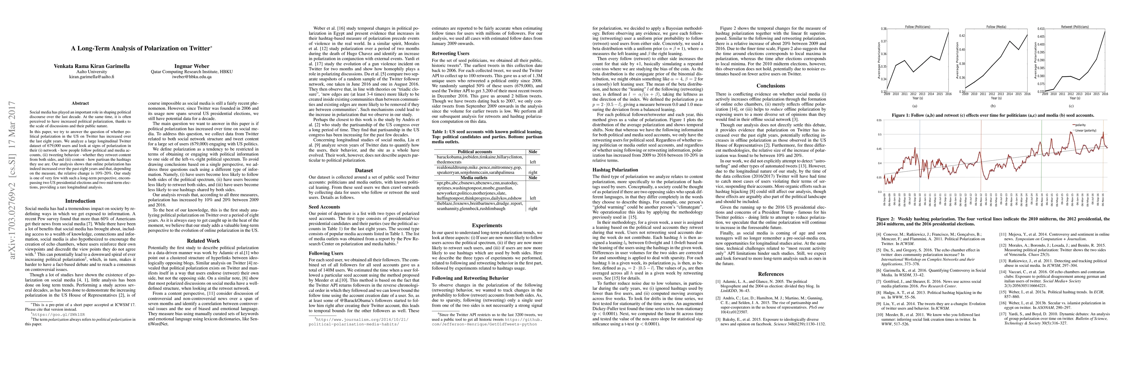 This paper analyzes a large longitudinal Twitter dataset to determine if political polarization in the US has increased over eight years, examining network, tweeting behavior, and content. The study finds a 10%-20% increase in polarization, offering a rare long-term perspective across multiple elections.
