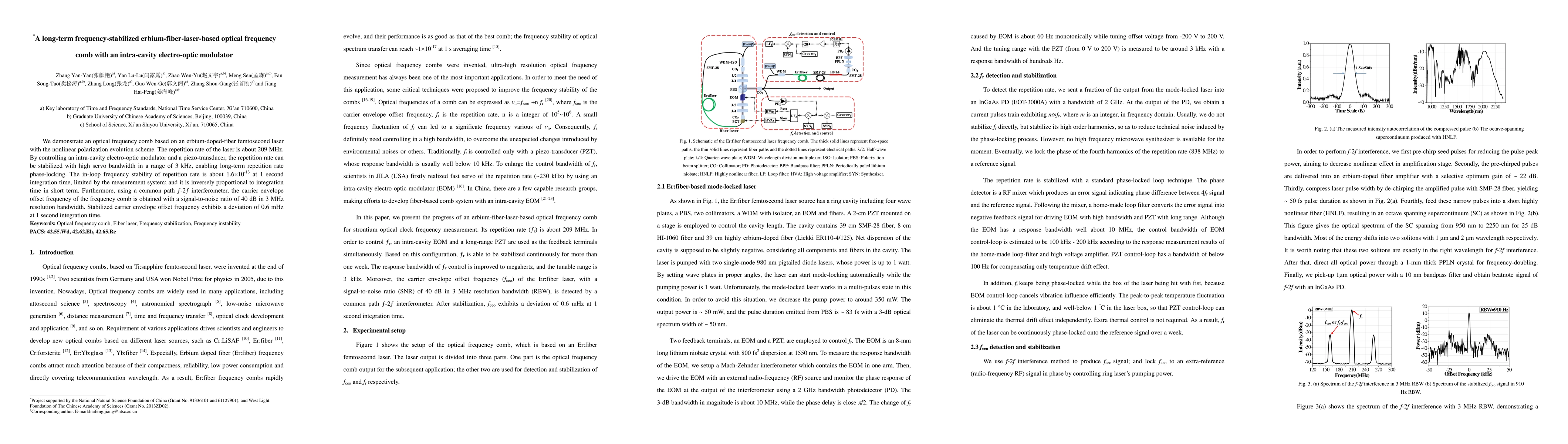 This research paper demonstrates a long-term stabilized optical frequency comb based on an erbium-fiber laser with an intra-cavity electro-optic modulator, achieving high frequency stability (1.6E-13 at 1 sec) and a carrier envelope offset frequency deviation of 0.6 mHz. The comb’s repetition rate is stabilized to within 3 kHz using an electro-optic modulator and piezo-transducer.