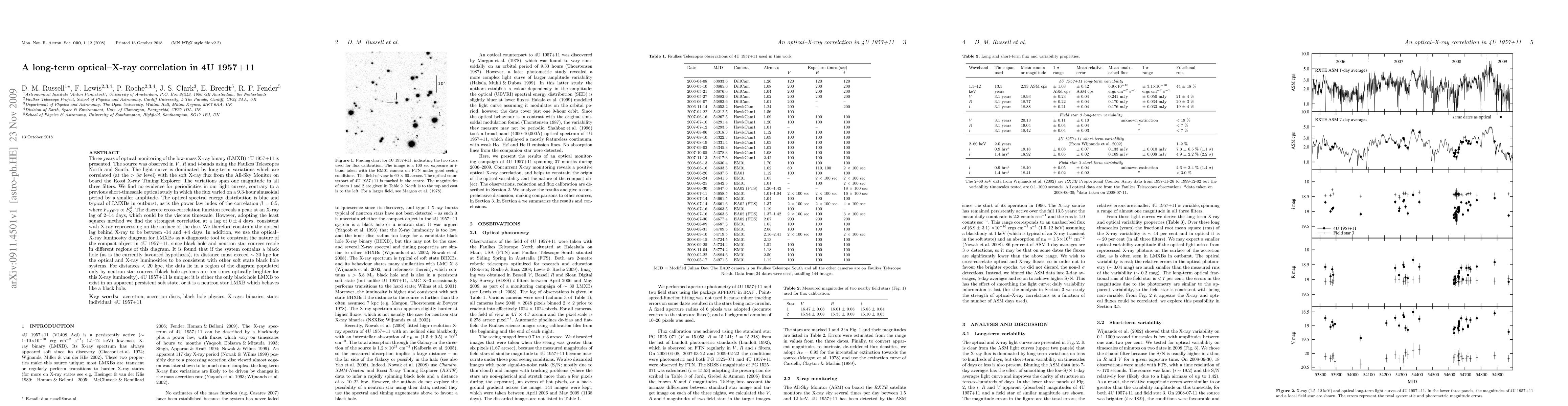 This study presents three years of optical monitoring of the low-mass X-ray binary 4U 1957+11, revealing long-term variations correlated with soft X-ray flux. The optical-X-ray lag suggests either viscous timescale or reprocessing on the disc, while the optical-X-ray luminosity diagram indicates the compact object may be a black hole at a distance exceeding 20 kpc.