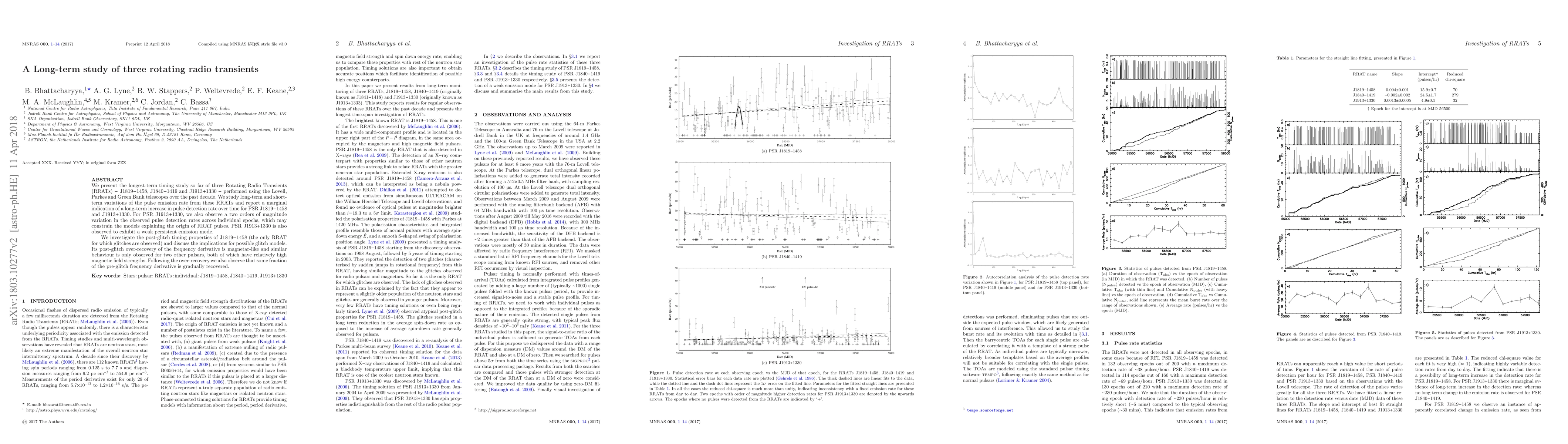 This long-term study of three Rotating Radio Transients (RRATs) reveals marginal evidence of increasing pulse detection rates over time for two of them, and significant variations in pulse rates for PSR J1913+1330, which also shows a weak persistent emission mode. The study also examines the post-glitch behavior of J1819-1458, finding magnetar-like over-recovery characteristics.