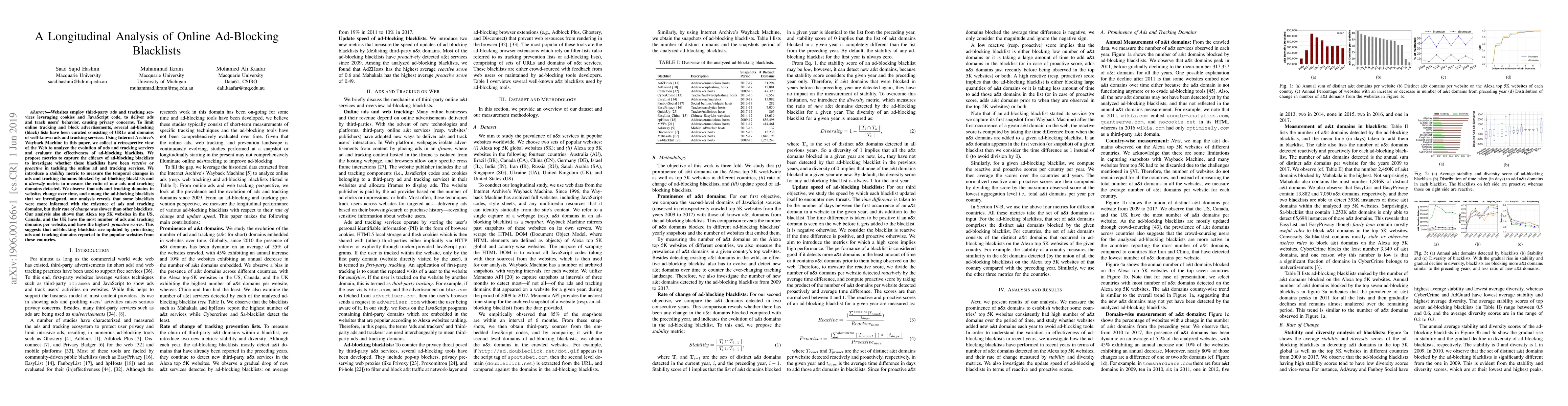 This paper analyzes the evolution of online ads and tracking services using Internet Archive's Wayback Machine, evaluating the effectiveness of ad-blocking blacklists. It introduces stability and diversity metrics to assess blacklist reactivity and finds that some blacklists are more informed but update slower, with popular US, Canada, and UK websites driving proactive updates.
