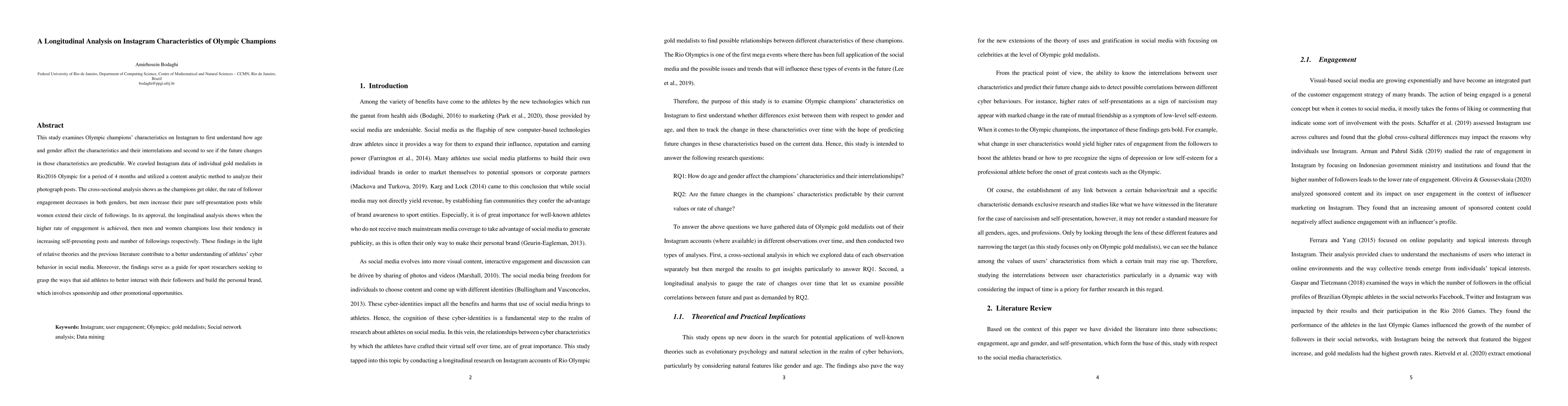 This study analyzes Instagram characteristics of Rio 2016 Olympic champions, finding that older athletes show decreased follower engagement, with men increasing self-presentation posts and women expanding their followings. Longitudinal analysis reveals that higher engagement rates diminish these trends, offering insights into athletes' social media behavior and branding strategies.