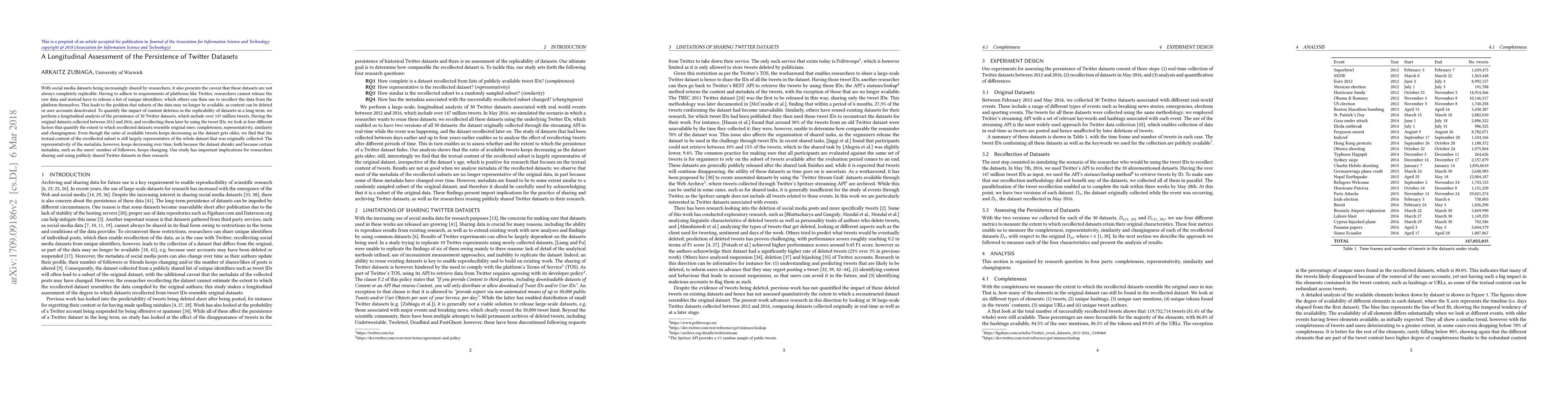 With social media datasets being increasingly shared by researchers, it also presents the caveat that those datasets are not always completely replicable. Having to adhere to requirements of platforms like Twitter, researchers cannot release the raw data and instead have to release a list of unique identifiers, which others can then use to recollect the data from the platform themselves. This leads to the problem that subsets of the data may no longer be available, as content can be deleted or user accounts deactivated. To quantify the impact of content deletion in the replicability of datasets in a long term, we perform a longitudinal analysis of the persistence of 30 Twitter datasets, which include over 147 million tweets. Having the original datasets collected between 2012 and 2016, and recollecting them later by using the tweet IDs, we look at four different factors that quantify the extent to which recollected datasets resemble original ones: completeness, representativity, similarity and changingness. Even though the ratio of available tweets keeps decreasing as the dataset gets older, we find that the textual content of the recollected subset is still largely representative of the whole dataset that was originally collected. The representativity of the metadata, however, keeps decreasing over time, both because the dataset shrinks and because certain metadata, such as the users' number of followers, keeps changing. Our study has important implications for researchers sharing and using publicly shared Twitter datasets in their research.