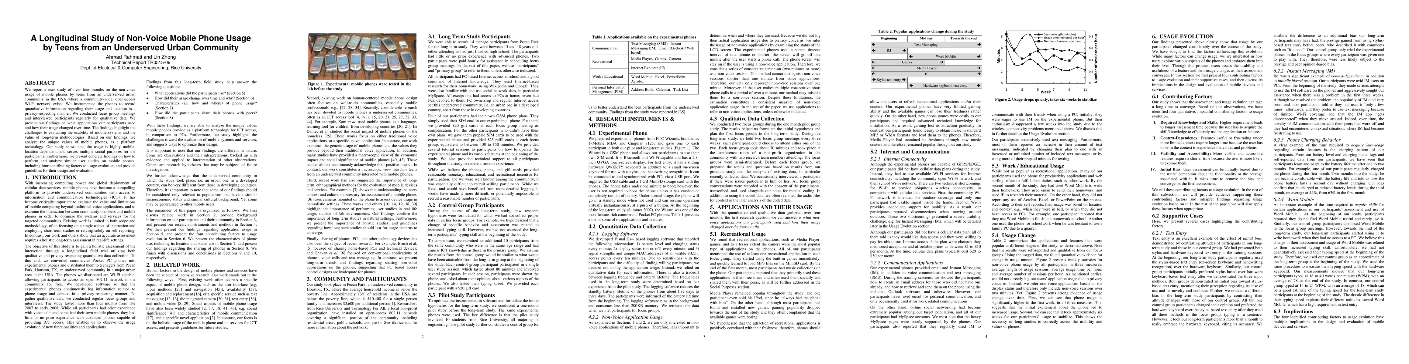A longitudinal study of teen mobile phone usage in an underserved urban community found that usage was highly mobile, location-dependent, and served multiple social purposes, highlighting the challenges and benefits of long-term user studies.
