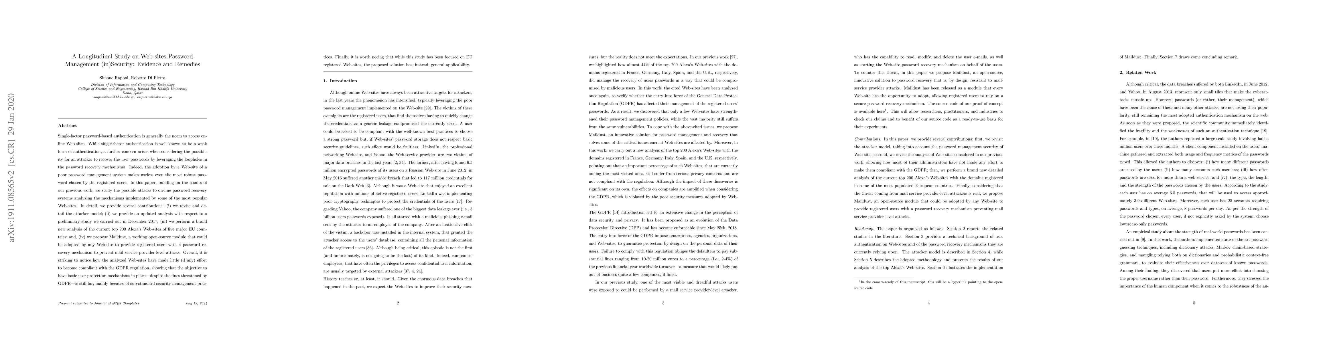 Single-factor password-based authentication is generally the norm to access on-line Web-sites. While single-factor authentication is well known to be a weak form of authentication, a further concern arises when considering the possibility for an attacker to recover the user passwords by leveraging the loopholes in the password recovery mechanisms. Indeed, the adoption by a Web-site of a poor password management system makes useless even the most robust password chosen by the registered users. In this paper, building on the results of our previous work, we study the possible attacks to on-line password recovery systems analyzing the mechanisms implemented by some of the most popular Web-sites. In detail, we provide several contributions: (i) we revise and detail the attacker model; (ii) we provide an updated analysis with respect to a preliminary study we carried out in December 2017; (iii) we perform a brand new analysis of the current top 200 Alexa's Web-sites of five major EU countries; and, (iv) we propose \sol, a working open-source module that could be adopted by any Web-site to provide registered users with a password recovery mechanism to prevent mail service provider-level attacks. Overall, it is striking to notice how the analyzed Web-sites have made little (if any) effort to become compliant with the GDPR regulation, showing that the objective to have basic user protection mechanisms in place---despite the fines threatened by GDPR---is still far, mainly because of sub-standard security management practices. Finally, it is worth noting that while this study has been focused on EU registered Web-sites, the proposed solution has, instead, general applicability.