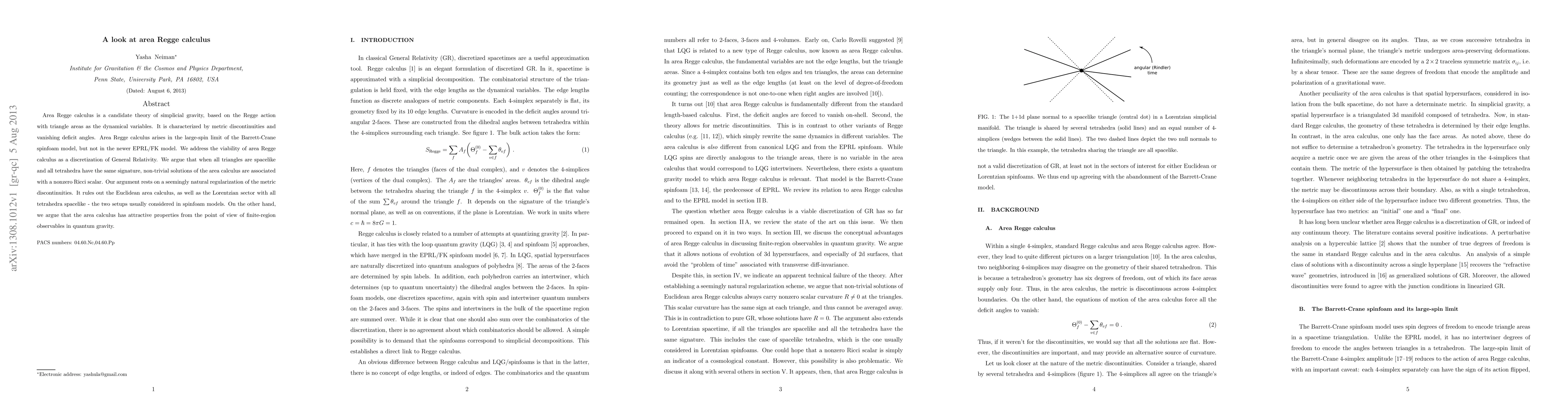 Summary: Area Regge calculus, a simplicial gravity theory, uses triangle areas as variables and is distinct from the EPRL/FK model. The paper argues that viable solutions arise when all triangles are spacelike and tetrahedra share the same signature, connecting non-trivial area calculus solutions to a nonzero Ricci scalar. This analysis suggests attractive finite-region observable properties in quantum gravity.