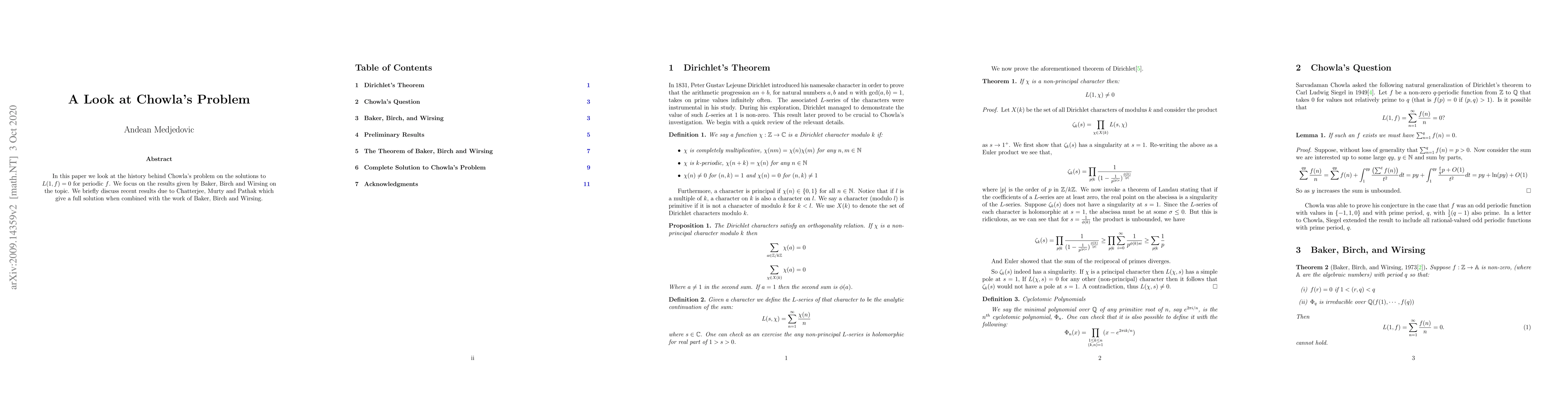 In this paper we look at the history behind Chowla's problem on the solutions to $L(1,f) = 0$ for periodic $f$. We focus on the results given by Baker, Birch and Wirsing on the topic. We briefly discuss recent results due to Chatterjee, Murty and Pathak which give a full solution when combined with the work of Baker, Birch and Wirsing.
