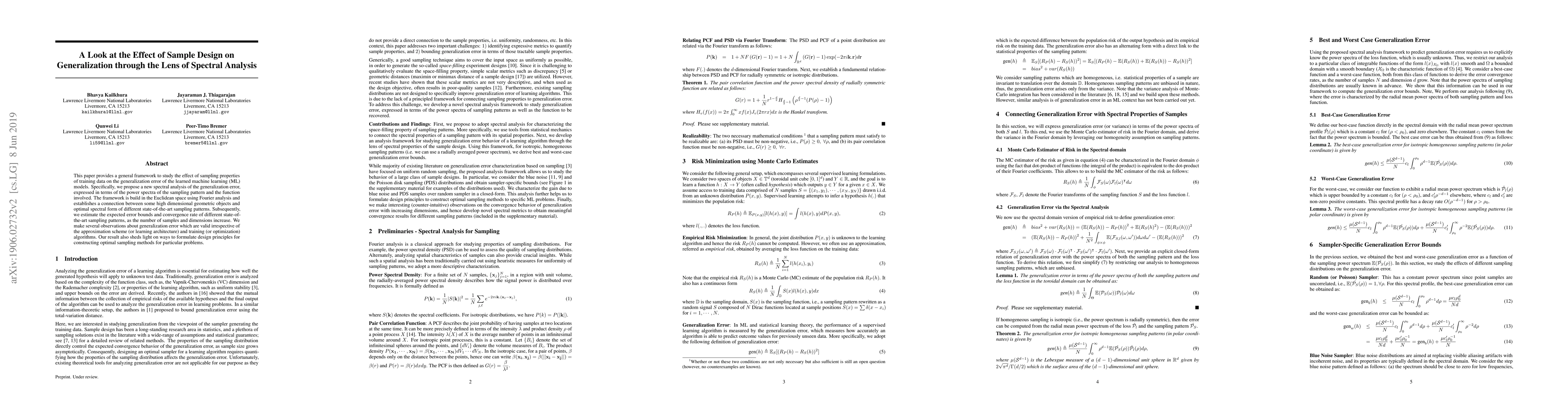 This paper provides a general framework to study the effect of sampling properties of training data on the generalization error of the learned machine learning (ML) models. Specifically, we propose a new spectral analysis of the generalization error, expressed in terms of the power spectra of the sampling pattern and the function involved. The framework is build in the Euclidean space using Fourier analysis and establishes a connection between some high dimensional geometric objects and optimal spectral form of different state-of-the-art sampling patterns. Subsequently, we estimate the expected error bounds and convergence rate of different state-of-the-art sampling patterns, as the number of samples and dimensions increase. We make several observations about generalization error which are valid irrespective of the approximation scheme (or learning architecture) and training (or optimization) algorithms. Our result also sheds light on ways to formulate design principles for constructing optimal sampling methods for particular problems.