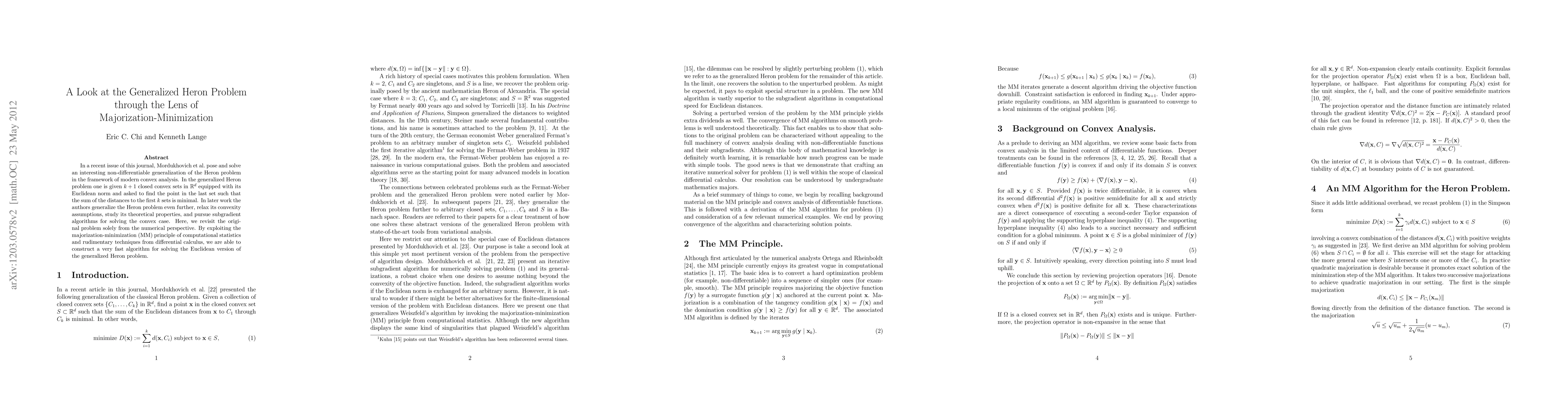This paper revisits the generalized Heron problem, focusing on a fast numerical solution using the majorization-minimization (MM) principle. The authors construct an efficient algorithm leveraging MM and differential calculus to solve the Euclidean version of the problem.