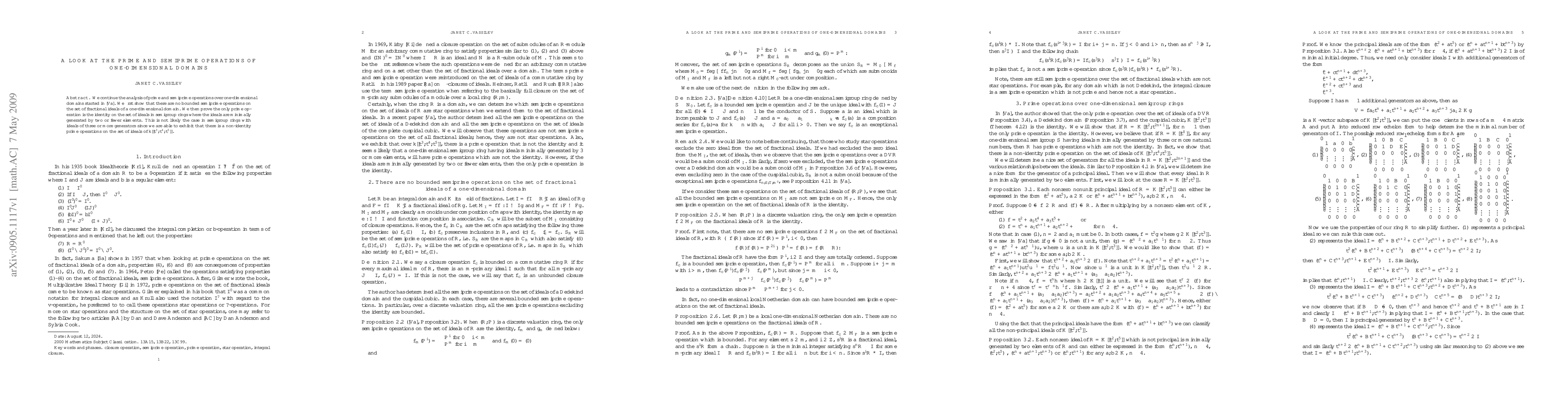 This paper examines prime and semiprime operations in one-dimensional domains, revealing no bounded semiprime operations on fractional ideals. It also demonstrates that the only prime operation on ideals in semigroup rings with two or fewer generators is the identity, but non-identity prime operations exist for ideals with three or more generators in rings like k[[t^3,t^4,t^5]].