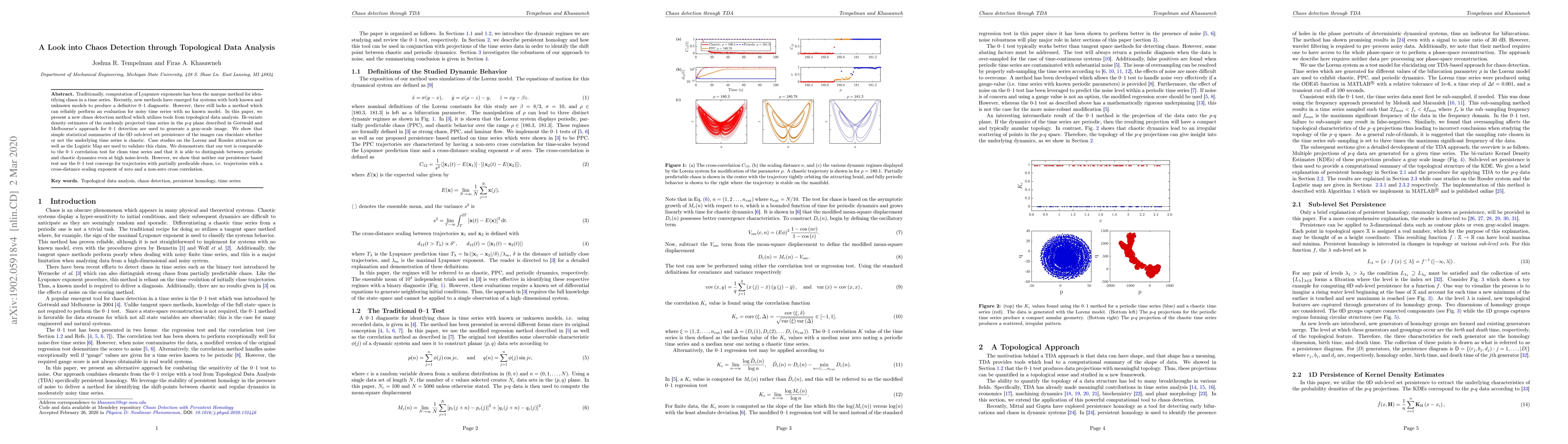 Traditionally, computation of Lyapunov exponents has been the marque method for identifying chaos in a time series. Recently, new methods have emerged for systems with both known and unknown models to produce a definitive 0--1 diagnostic. However, there still lacks a method which can reliably perform an evaluation for noisy time series with no known model. In this paper, we present a new chaos detection method which utilizes tools from topological data analysis. Bi-variate density estimates of the randomly projected time series in the $p$-$q$ plane described in Gottwald and Melbourne's approach for 0--1 detection are used to generate a gray-scale image. We show that simple statistical summaries of the 0D sub-level set persistence of the images can elucidate whether or not the underlying time series is chaotic. Case studies on the Lorenz and Rossler attractors as well as the Logistic Map are used to validate this claim. We demonstrate that our test is comparable to the 0--1 correlation test for clean time series and that it is able to distinguish between periodic and chaotic dynamics even at high noise-levels. However, we show that neither our persistence based test nor the 0--1 test converge for trajectories with partially predicable chaos, i.e. trajectories with a cross-distance scaling exponent of zero and a non-zero cross correlation.