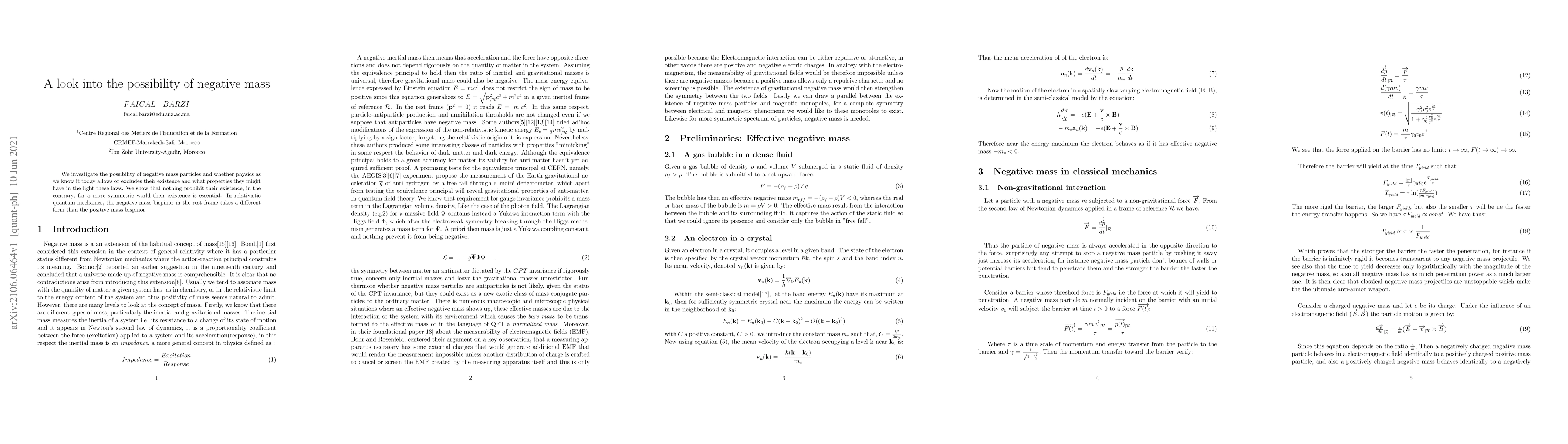 We investigate the possibility of negative mass particles and whether physics as we know it today allows or excludes their existence and what properties they might have in the light these laws. We show that nothing prohibit their existence, in the contrary, for a more symmetric world their existence is essential. In relativistic quantum mechanics, the negative mass bispinor in the rest frame takes a different form than the positive mass bispinor.