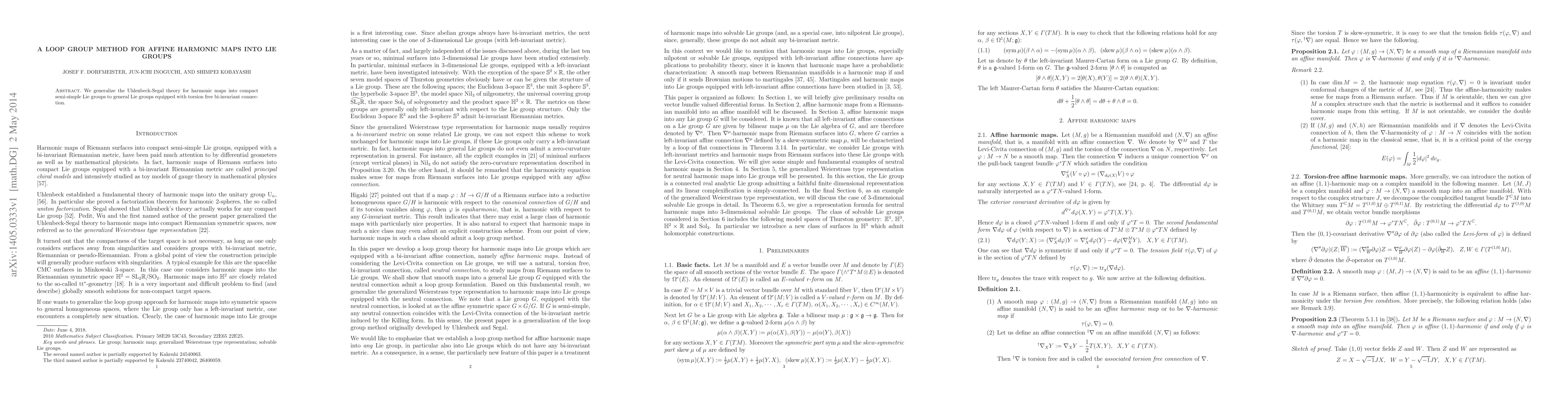Summary: The paper generalizes Uhlenbeck-Segal theory for harmonic maps to apply to affine harmonic maps into general Lie groups using a loop group method and torsion-free bi-invariant connections. The approach provides a new framework for understanding these maps in a broader mathematical context.
