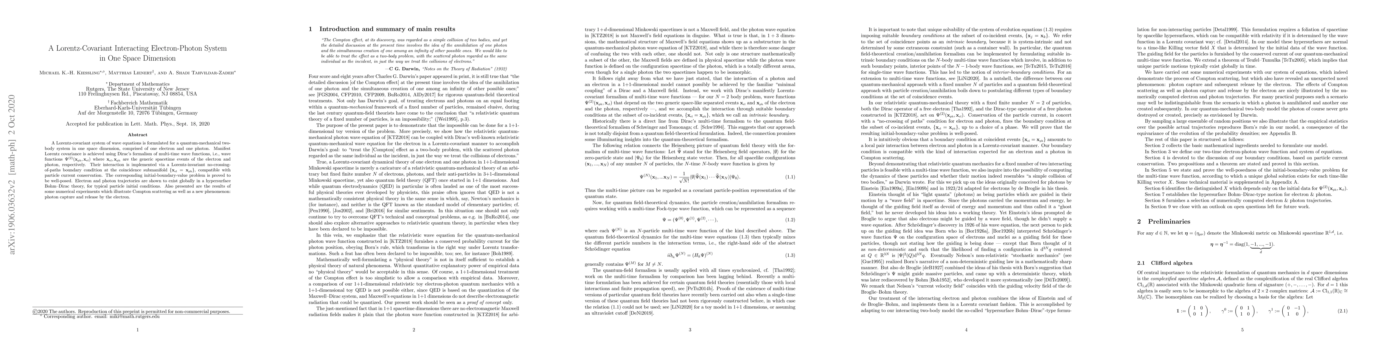 A Lorenz-covariant system of wave equations is formulated for a quantum-mechanical two-body system in one space dimension, comprised of one electron and one photon. Manifest Lorentz covariance is achieved using Dirac's formalism of multi-time wave functions, i.e., wave functions $\Psi(\mathbf{x}_{{ph}},\mathbf{x}_{{el}})$ where $\mathbf{x}_{{el}},\mathbf{x}_{{ph}}$ are the generic spacetime events of the electron and photon, respectively. Their interaction is implemented via a Lorentz-invariant no-crossing-of-paths boundary condition at the coincidence submanifold $\{\mathbf{x}_{{el}}=\mathbf{x}_{{ph}}\}$, compatible with particle current conservation. The corresponding initial-boundary-value problem is proved to be well-posed. Electron and photon trajectories are shown to exist globally in a Hypersurface Bohm--Dirac theory, for typical particle initial conditions. Also presented are the results of some numerical experiments which illustrate Compton scattering as well as a new phenomenon: photon capture and release by the electron.