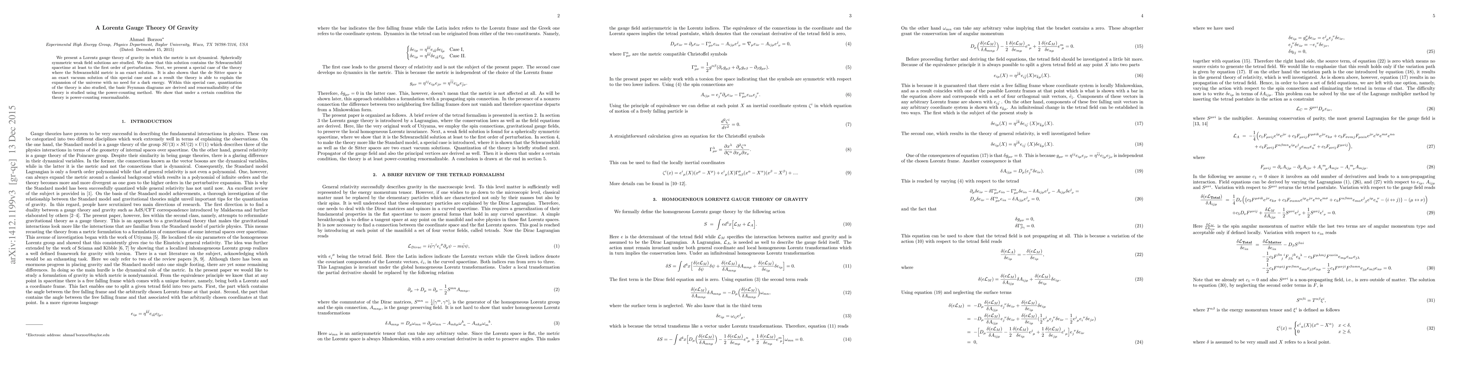 We present a Lorentz gauge theory of gravity in which the metric is not dynamical. Spherically symmetric weak field solutions are studied. We show that this solution contains the Schwarzschild spacetime at least to the first order of perturbation. Next, we present a special case of the theory. It is shown that the Schwarzschild metric is now an exact solution. Moreover, we show that the de Sitter space is an exact vacuum solution and as a result the theory is able to explain the expansion of the universe with no need for a dark energy. Within this special case, quantization of the theory is also studied. The basic Feynman diagrams are derived and renormalizability of the theory is studied using the power-counting method. We show that under a certain condition the theory is power-counting renormalizable.