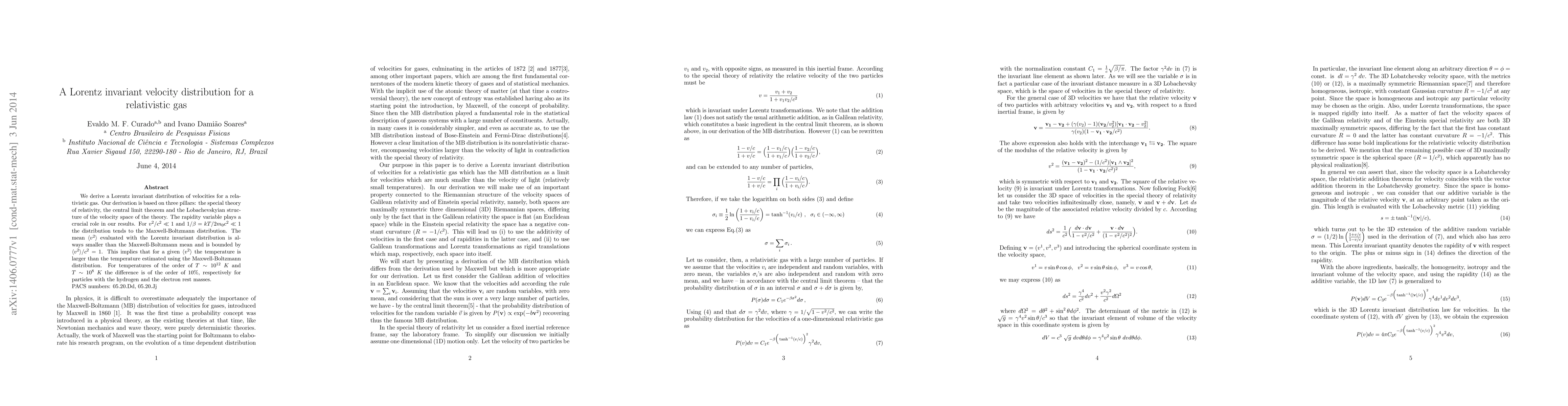 This paper derives a Lorentz invariant velocity distribution for a relativistic gas, grounded in special relativity, the central limit theorem, and the Lobachevskyian structure of velocity space. The distribution shows that for low velocities and temperatures, it approximates the Maxwell-Boltzmann distribution, but with a smaller mean velocity squared, implying higher temperatures for given velocity squared values.