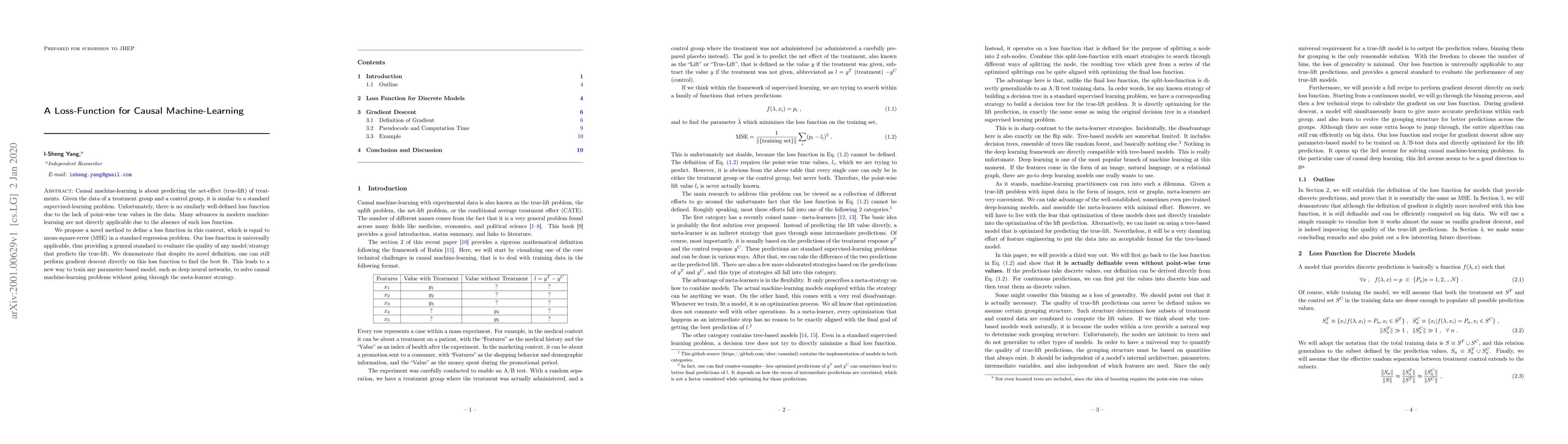 Causal machine-learning is about predicting the net-effect (true-lift) of treatments. Given the data of a treatment group and a control group, it is similar to a standard supervised-learning problem. Unfortunately, there is no similarly well-defined loss function due to the lack of point-wise true values in the data. Many advances in modern machine-learning are not directly applicable due to the absence of such loss function. We propose a novel method to define a loss function in this context, which is equal to mean-square-error (MSE) in a standard regression problem. Our loss function is universally applicable, thus providing a general standard to evaluate the quality of any model/strategy that predicts the true-lift. We demonstrate that despite its novel definition, one can still perform gradient descent directly on this loss function to find the best fit. This leads to a new way to train any parameter-based model, such as deep neural networks, to solve causal machine-learning problems without going through the meta-learner strategy.
