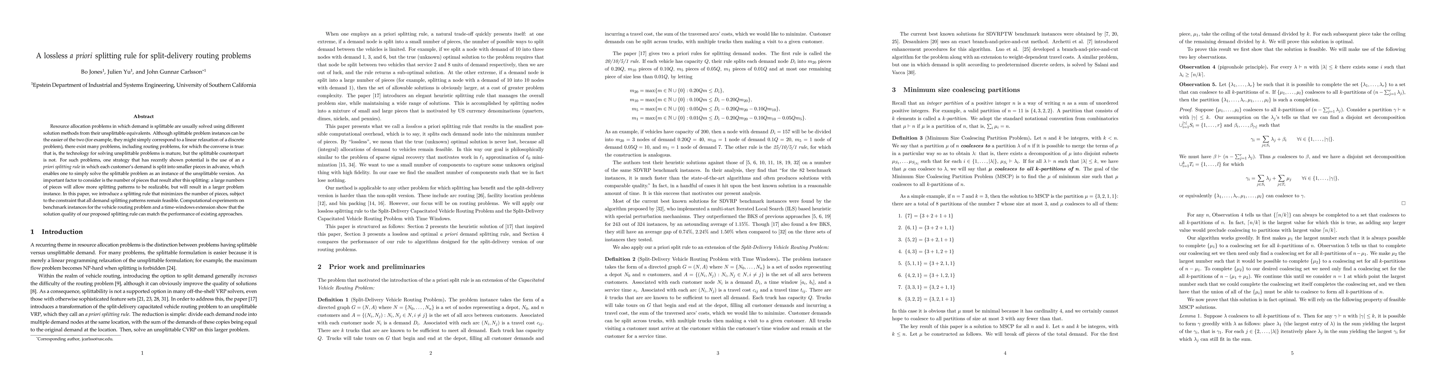 The paper introduces an a priori splitting rule for split-delivery routing problems, minimizing the number of pieces resulting from demand splitting while maintaining feasible splitting patterns.