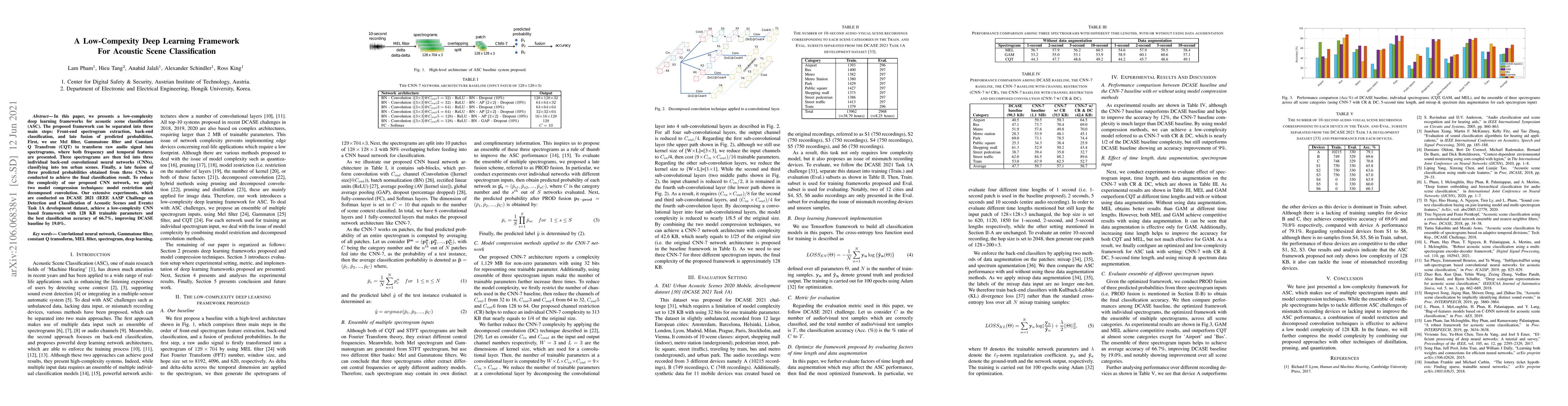 In this paper, we presents a low-complexity deep learning frameworks for acoustic scene classification (ASC). The proposed framework can be separated into three main steps: Front-end spectrogram extraction, back-end classification, and late fusion of predicted probabilities. First, we use Mel filter, Gammatone filter and Constant Q Transfrom (CQT) to transform raw audio signal into spectrograms, where both frequency and temporal features are presented. Three spectrograms are then fed into three individual back-end convolutional neural networks (CNNs), classifying into ten urban scenes. Finally, a late fusion of three predicted probabilities obtained from three CNNs is conducted to achieve the final classification result. To reduce the complexity of our proposed CNN network, we apply two model compression techniques: model restriction and decomposed convolution. Our extensive experiments, which are conducted on DCASE 2021 (IEEE AASP Challenge on Detection and Classification of Acoustic Scenes and Events) Task 1A development dataset, achieve a low-complexity CNN based framework with 128 KB trainable parameters and the best classification accuracy of 66.7%, improving DCASE baseline by 19.0%