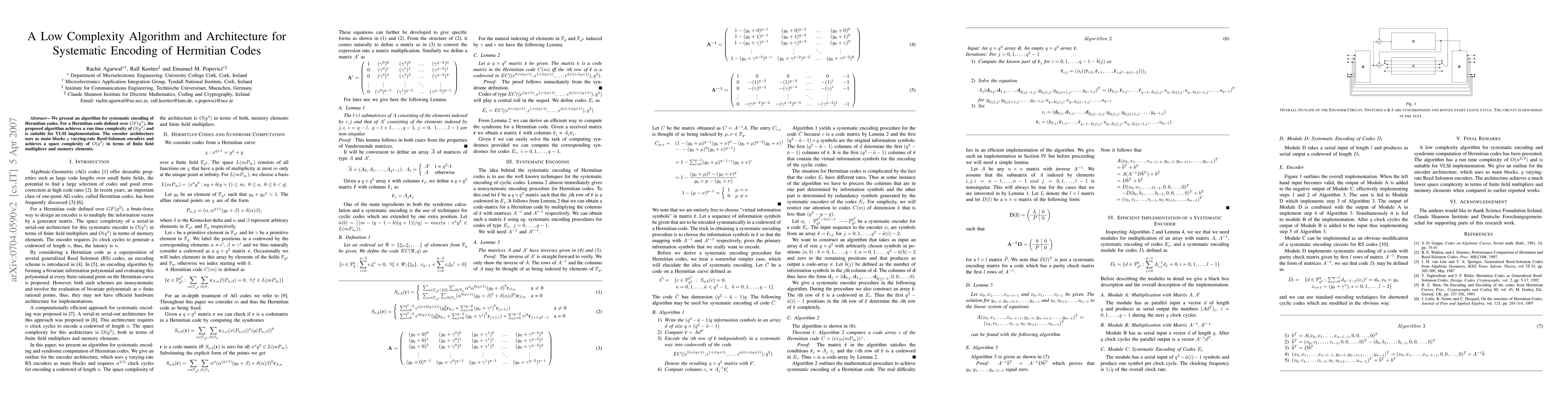 Summary: The paper introduces a low complexity algorithm and architecture for encoding Hermitian codes with a runtime of O(q^2), suitable for VLSI implementation, using q varying-rate Reed-Solomon encoders. The space complexity is also O(q^2) regarding finite field multipliers and memory.