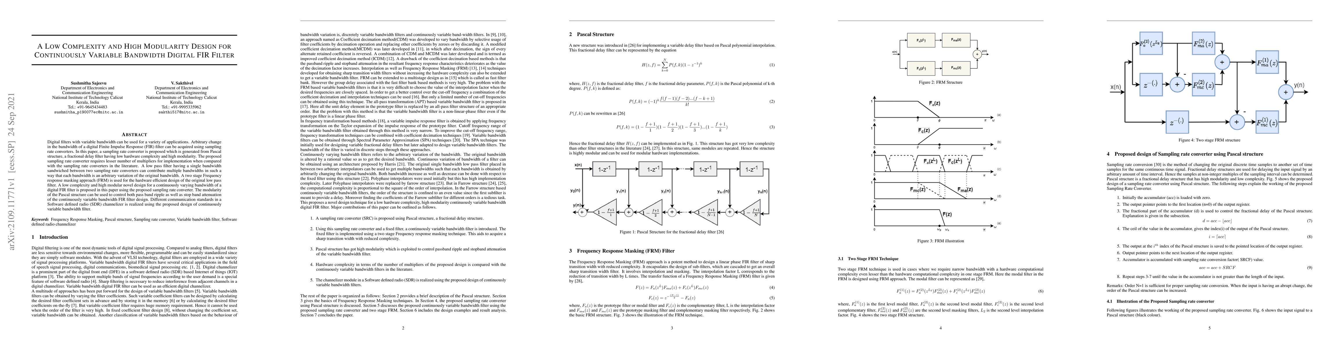 This paper proposes a low complexity and high modularity design for continuously variable bandwidth digital filters using a novel sampling rate converter based on Pascal structure. The design achieves multiple bandwidths with fewer multipliers and utilizes a two-stage Frequency response masking approach for efficient hardware implementation.
