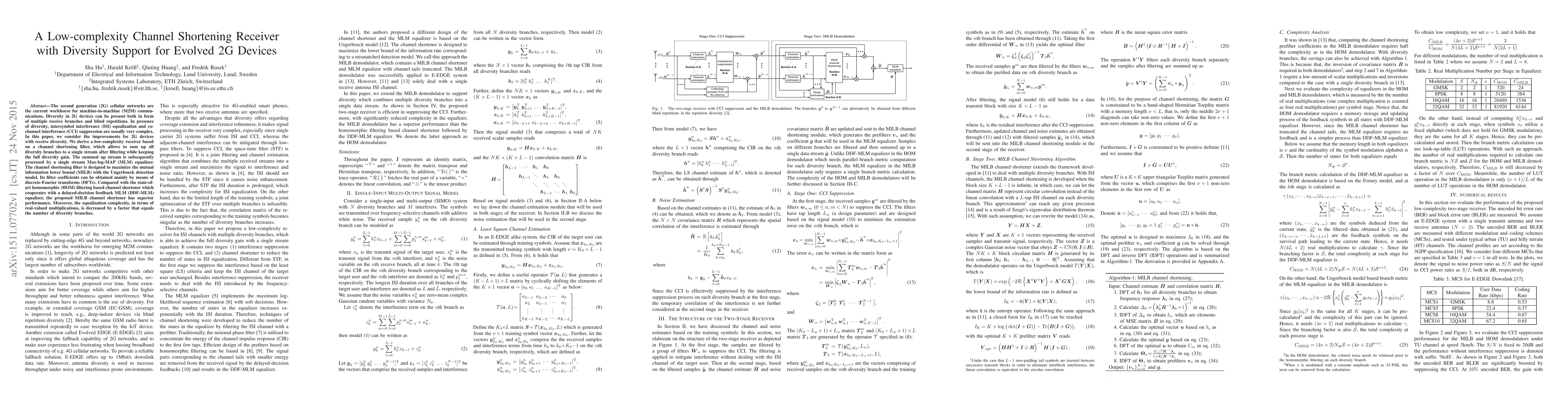The second generation (2G) cellular networks are the current workhorse for machine-to-machine (M2M) communications. Diversity in 2G devices can be present both in form of multiple receive branches and blind repetitions. In presence of diversity, intersymbol interference (ISI) equalization and co-channel interference (CCI) suppression are usually very complex. In this paper, we consider the improvements for 2G devices with receive diversity. We derive a low-complexity receiver based on a channel shortening filter, which allows to sum up all diversity branches to a single stream after filtering while keeping the full diversity gain. The summed up stream is subsequently processed by a single stream Max-log-MAP (MLM) equalizer. The channel shortening filter is designed to maximize the mutual information lower bound (MILB) with the Ungerboeck detection model. Its filter coefficients can be obtained mainly by means of discrete-Fourier transforms (DFTs). Compared with the state-of-art homomorphic (HOM) filtering based channel shortener which cooperates with a delayed-decision feedback MLM (DDF-MLM) equalizer, the proposed MILB channel shortener has superior performance. Moreover, the equalization complexity, in terms of real-valued multiplications, is decreased by a factor that equals the number of diversity branches.