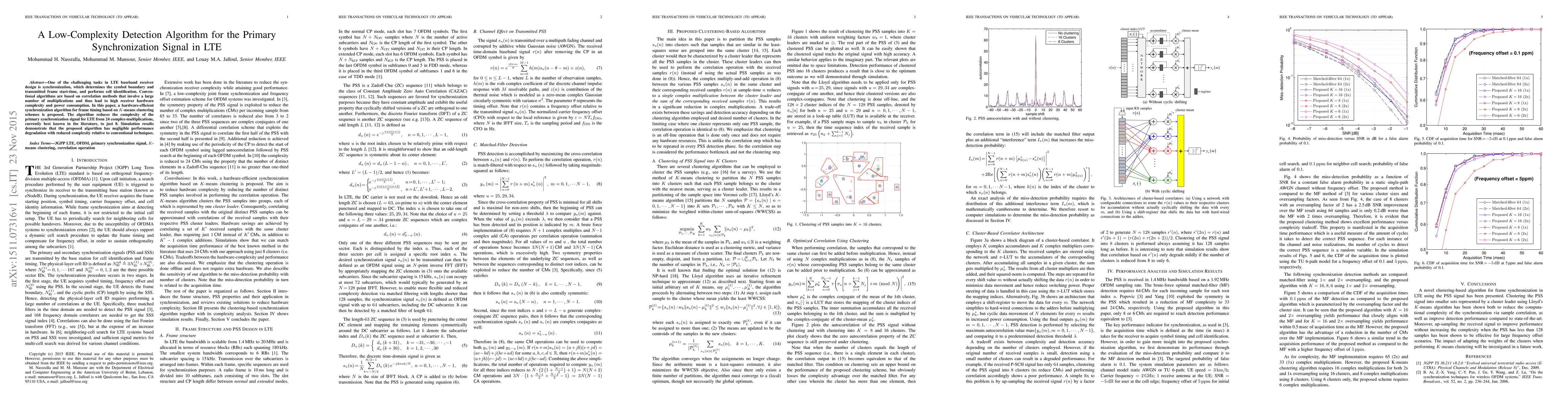 This paper proposes a low-complexity detection algorithm for LTE's primary synchronization signal using K-means clustering, reducing the complexity from 24 to 8 complex-multiplications while maintaining performance.