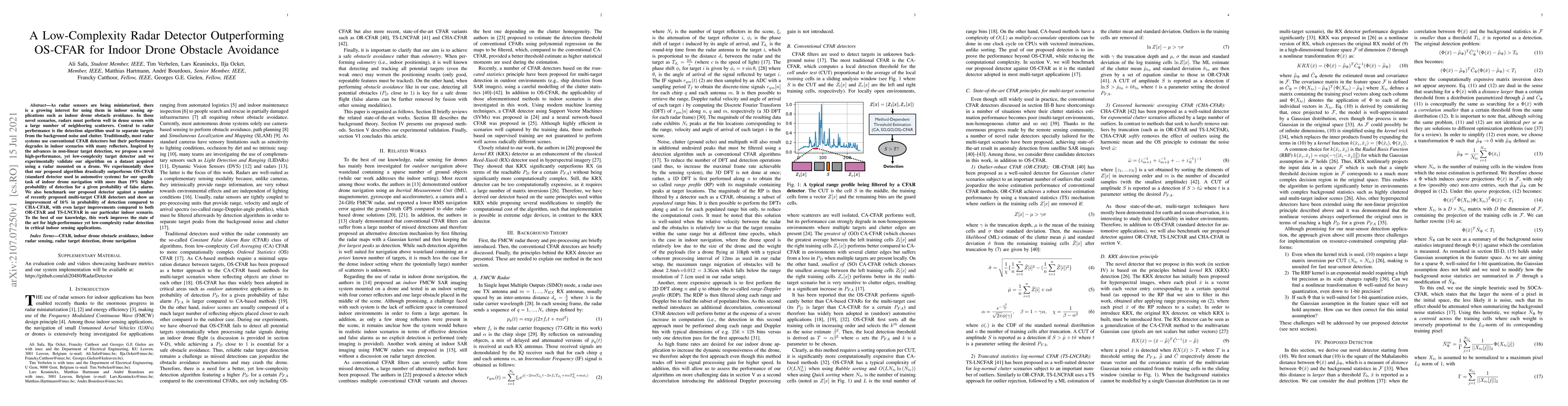 This paper proposes a novel low-complexity radar detector that significantly outperforms traditional OS-CFAR for indoor drone obstacle avoidance, achieving a 19% higher detection probability while maintaining lower complexity. The proposed detector also shows a 16% improvement over CHA-CFAR and outperforms OR-CFAR and TS-LNCFAR in indoor scenarios.