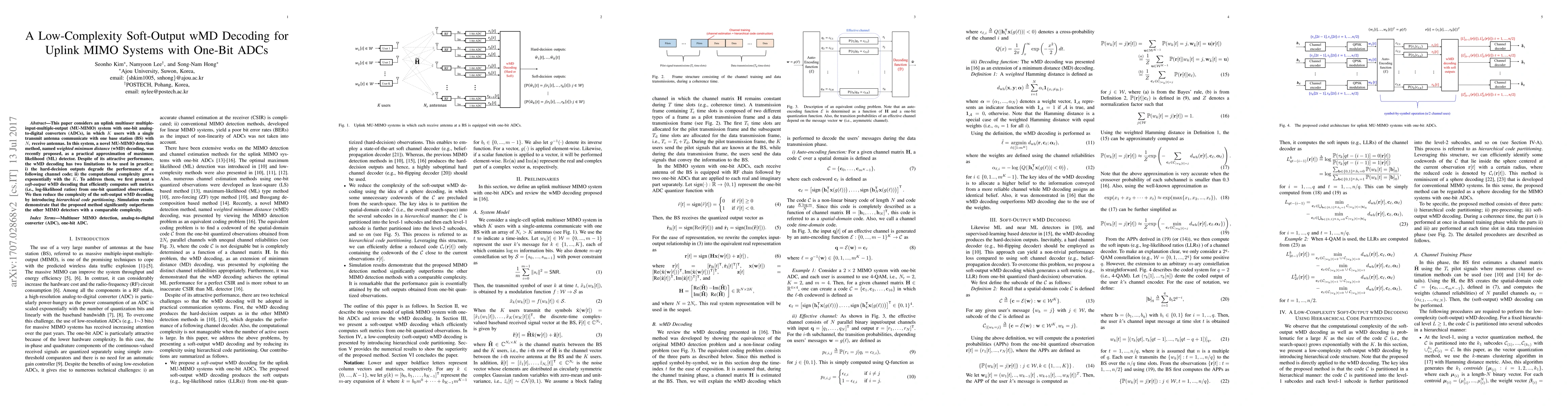 This paper proposes a low-complexity soft-output weighted minimum distance (wMD) decoding method for uplink MU-MIMO systems with one-bit ADCs, addressing the performance degradation and high complexity issues of traditional wMD decoding through hierarchical code partitioning and efficient computation of soft metrics.