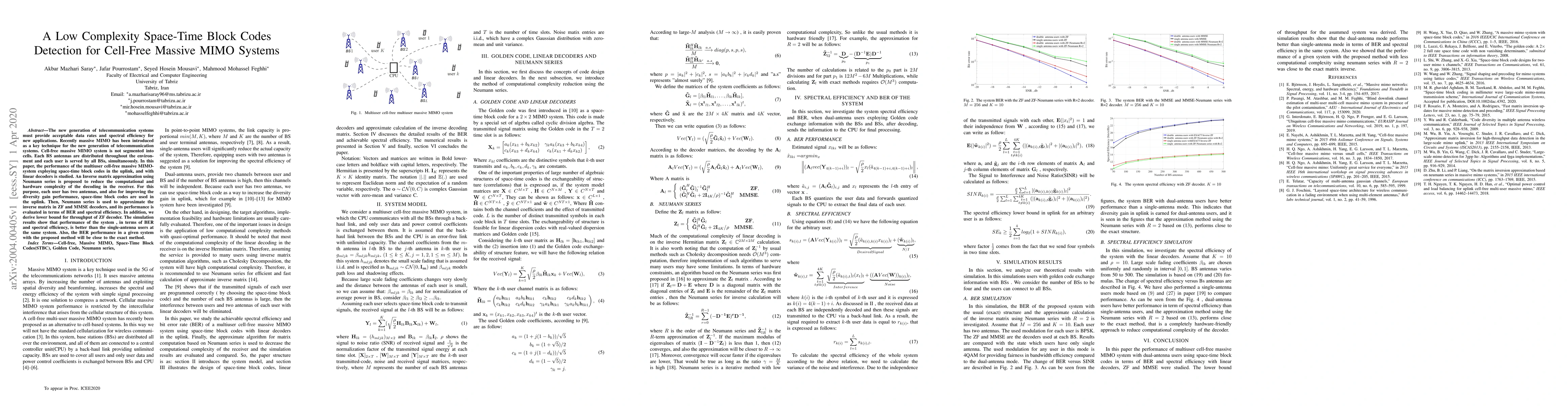The new generation of telecommunication systems must provide acceptable data rates and spectral efficiency for new applications. Recently massive MIMO has been introduced as a key technique for the new generation of telecommunication systems. Cell-free massive MIMO system is not segmented into cells. Each BS antennas are distributed throughout the environment and each user is served by all BSs, simultaneously. In this paper, the performance of the multiuser cell-free massive MIMO-system exploying space-time block codes in the uplink, and with linear decoders is studied. An Inverse matrix approximation using Neumann series is proposed to reduce the computational and hardware complexity of the decoding in the receiver. For this purpose, each user has two antennas, and also for improving the diversity gain performance, space-time block codes are used in the uplink. Then, Neumann series is used to approximate the inverse matrix in ZF and MMSE decoders, and its performance is evaluated in terms of BER and spectral efficiency. In addition, we derive lower bound for throughput of ZF decoder. The simulation results show that performance of the system , in terms of BER and spectral efficiency, is better than the single-antenna users at the same system. Also, the BER performance in a given system with the proposed method will be close to the exact method.