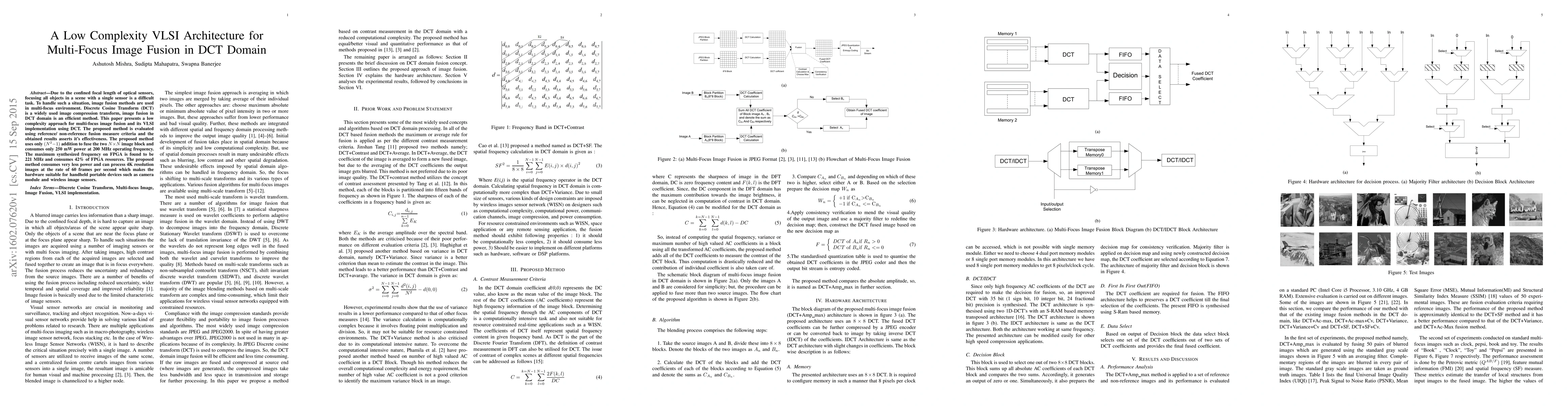 Due to the confined focal length of optical sensors, focusing all objects in a scene with a single sensor is a difficult task. To handle such a situation, image fusion methods are used in multi-focus environment. Discrete Cosine Transform (DCT) is a widely used image compression transform, image fusion in DCT domain is an efficient method. This paper presents a low complexity approach for multi-focus image fusion and its VLSI implementation using DCT. The proposed method is evaluated using reference/non-reference fusion measure criteria and the obtained results asserts it's effectiveness. The maximum synthesized frequency on FPGA is found to be 221 MHz and consumes 42% of FPGA resources. The proposed method consumes very less power and can process 4K resolution images at the rate of 60 frames per second which makes the hardware suitable for handheld portable devices such as camera module and wireless image sensors.