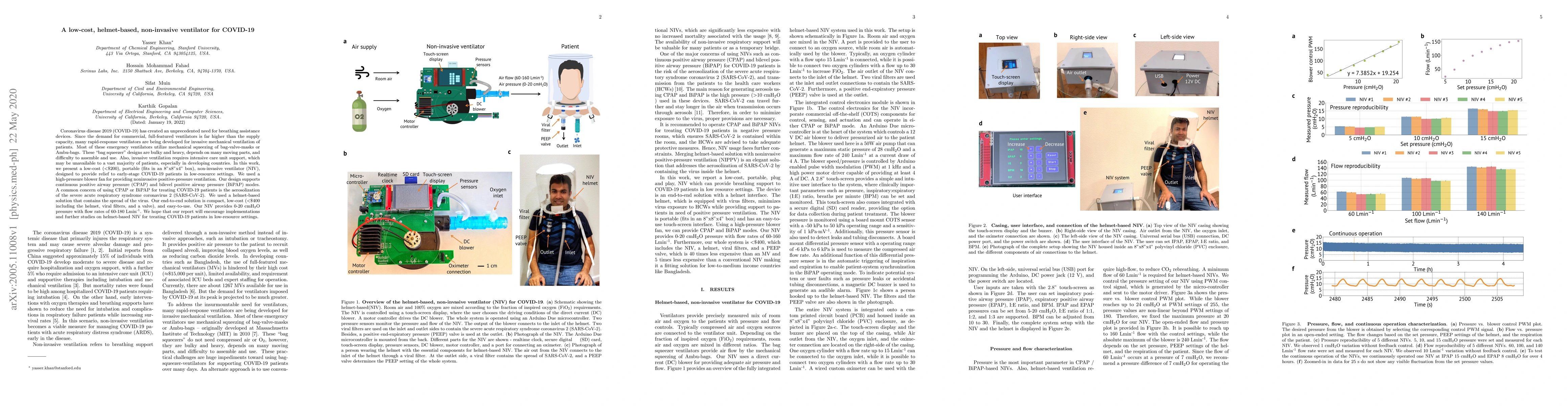Coronavirus disease 2019 (COVID-19) has created an unprecedented need for breathing assistance devices. Since the demand for commercial, full-featured ventilators is far higher than the supply capacity, many rapid-response ventilators are being developed for invasive mechanical ventilation of patients. Most of these emergency ventilators utilize mechanical squeezing of bag-valve-masks or Ambu-bags. These "bag squeezer" designs are bulky and heavy, depends on many moving parts, and difficulty to assemble and use. Also, invasive ventilation requires intensive care unit support, which may be unavailable to a vast majority of patients, especially in developing countries. In this work, we present a low-cost ($<$\$200), portable (fits in an 8"x8"x4" box), non-invasive ventilator (NIV), designed to provide relief to early-stage COVID-19 patients in low-resource settings. We used a high-pressure blower fan for providing noninvasive positive-pressure ventilation. Our design supports continuous positive airway pressure (CPAP) and bilevel positive airway pressure (BiPAP) modes. A common concern of using CPAP or BiPAP for treating COVID-19 patients is the aerosolization of the severe acute respiratory syndrome coronavirus 2 (SARS-CoV-2). We used a helmet-based solution that contains the spread of the virus. Our end-to-end solution is compact, low-cost ($<$\$400 including the helmet, viral filters, and a valve), and easy-to-use. Our NIV provides 0-20 cmH$_{2}$O pressure with flow rates of 60-180 Lmin$^{-1}$. We hope that our report will encourage implementations and further studies on helmet-based NIV for treating COVID-19 patients in low-resource settings.