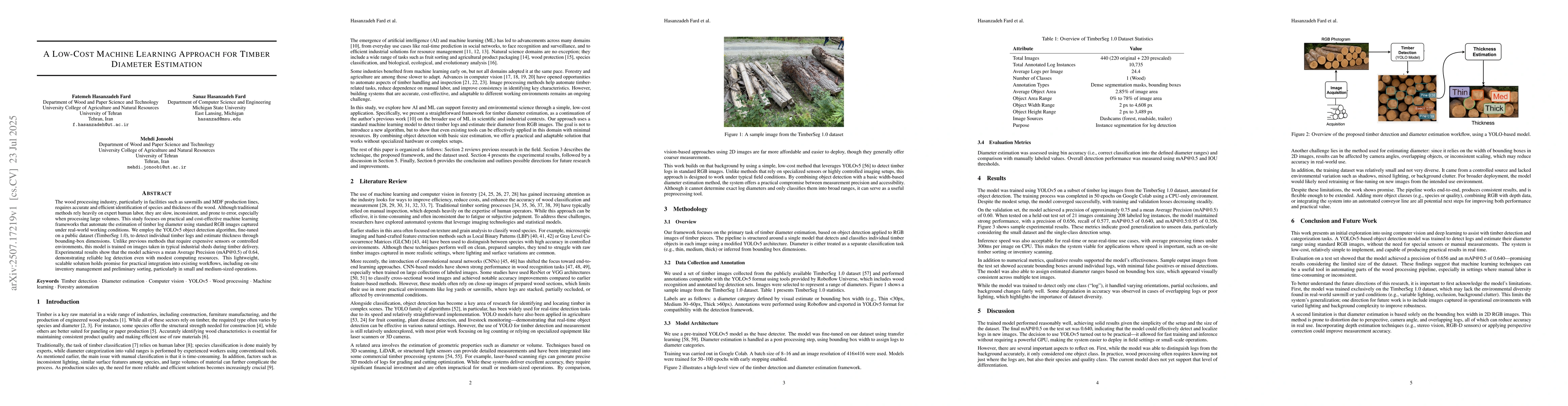 The wood processing industry, particularly in facilities such as sawmills and MDF production lines, requires accurate and efficient identification of species and thickness of the wood. Although traditional methods rely heavily on expert human labor, they are slow, inconsistent, and prone to error, especially when processing large volumes. This study focuses on practical and cost-effective machine learning frameworks that automate the estimation of timber log diameter using standard RGB images captured under real-world working conditions. We employ the YOLOv5 object detection algorithm, fine-tuned on a public dataset (TimberSeg 1.0), to detect individual timber logs and estimate thickness through bounding-box dimensions. Unlike previous methods that require expensive sensors or controlled environments, this model is trained on images taken in typical industrial sheds during timber delivery. Experimental results show that the model achieves a mean Average Precision ([email protected]) of 0.64, demonstrating reliable log detection even with modest computing resources. This lightweight, scalable solution holds promise for practical integration into existing workflows, including on-site inventory management and preliminary sorting, particularly in small and medium-sized operations.