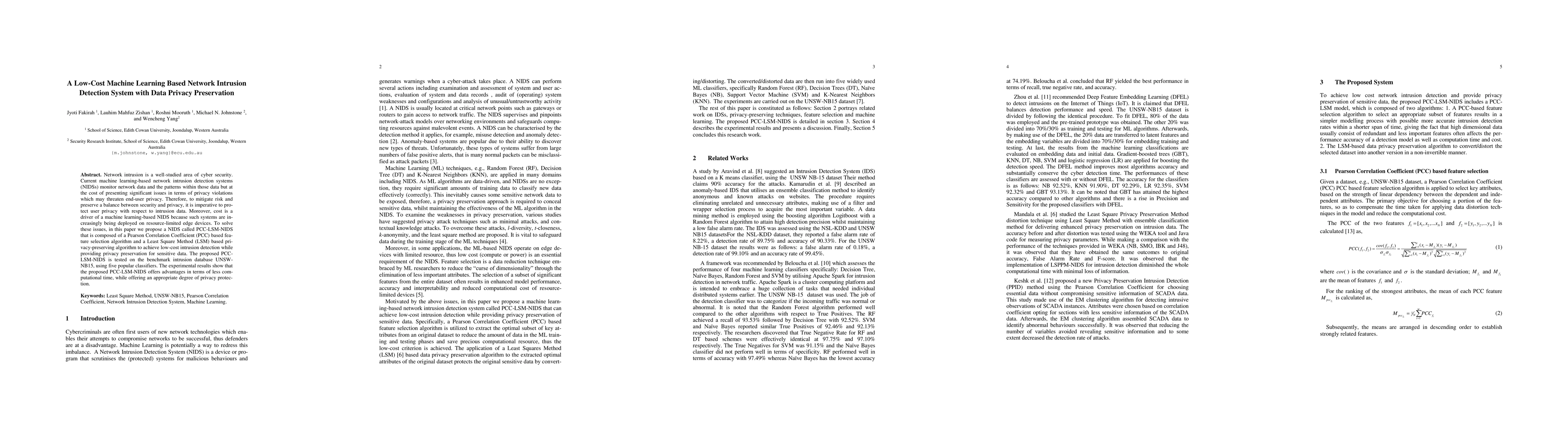 This paper proposes a low-cost machine learning-based network intrusion detection system (PCC-LSM-NIDS) that uses a Pearson Correlation Coefficient (PCC) feature selection and a Least Square Method (LSM) for privacy preservation, achieving efficient detection with minimal computational cost while safeguarding user privacy. Experimental results on UNSW-NB15 show reduced computational time and effective privacy protection.