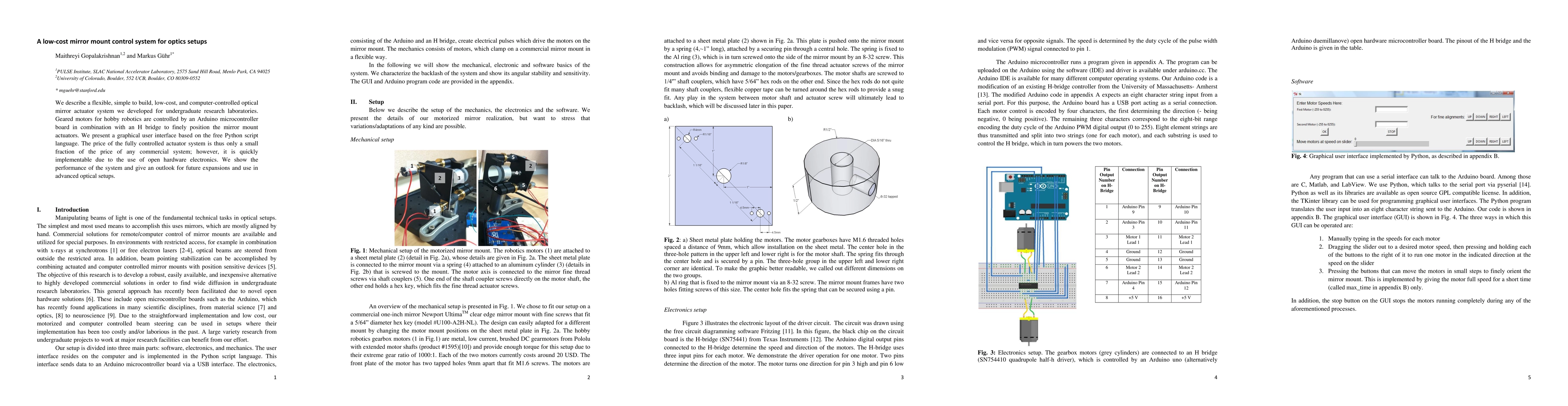 We describe a flexible, simple to build, low-cost, and computer-controlled optical mirror actuator system we developed for undergraduate research laboratories. Geared motors for hobby robotics are controlled by an Arduino microcontroller board in combination with an H bridge to finely position the mirror mount actuators. We present a graphical user interface based on the free Python script language. The price of the fully controlled actuator system is thus only a small fraction of the price of any commercial system; however, it is quickly implementable due to the use of open hardware electronics. We show the performance of the system and give an outlook for future expansions and use in advanced optical setups.