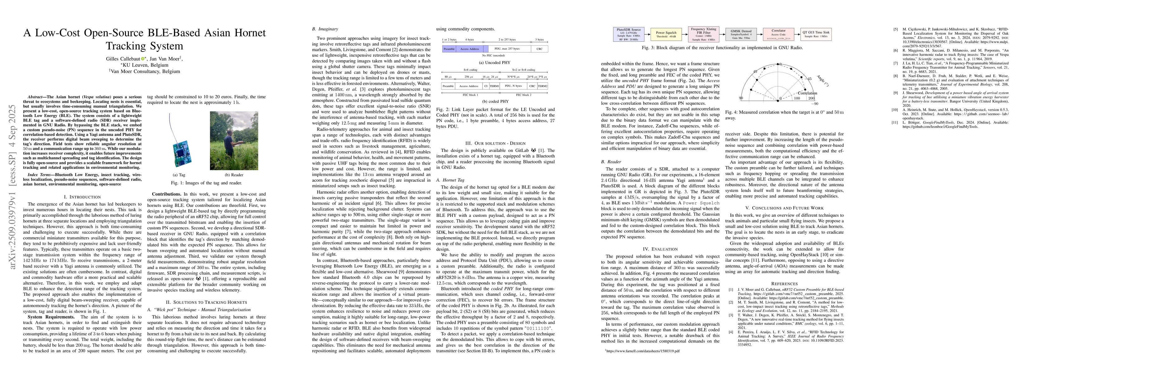 The Asian hornet (Vespa velutina) poses a serious threat to ecosystems and beekeeping. Locating nests is essential, but usually involves time-consuming manual triangulation. We present a low-cost, open-source tracking system based on Bluetooth Low Energy (BLE). The system consists of a lightweight BLE tag and a software-defined radio (SDR) receiver implemented in GNU Radio. By bypassing the BLE stack, we embed a custom pseudo-noise (PN) sequence in the uncoded PHY for correlation-based detection. Using a Yagi antenna and PlutoSDR, the receiver performs digital beam sweeping to determine the tag's direction. Field tests show reliable angular resolution at 50m and a communication range up to 360m. While our modulation increases receiver complexity, it enables future improvements such as multichannel spreading and tag identification. The design is fully open-source and provides a scalable framework for hornet tracking and related applications in environmental monitoring.
