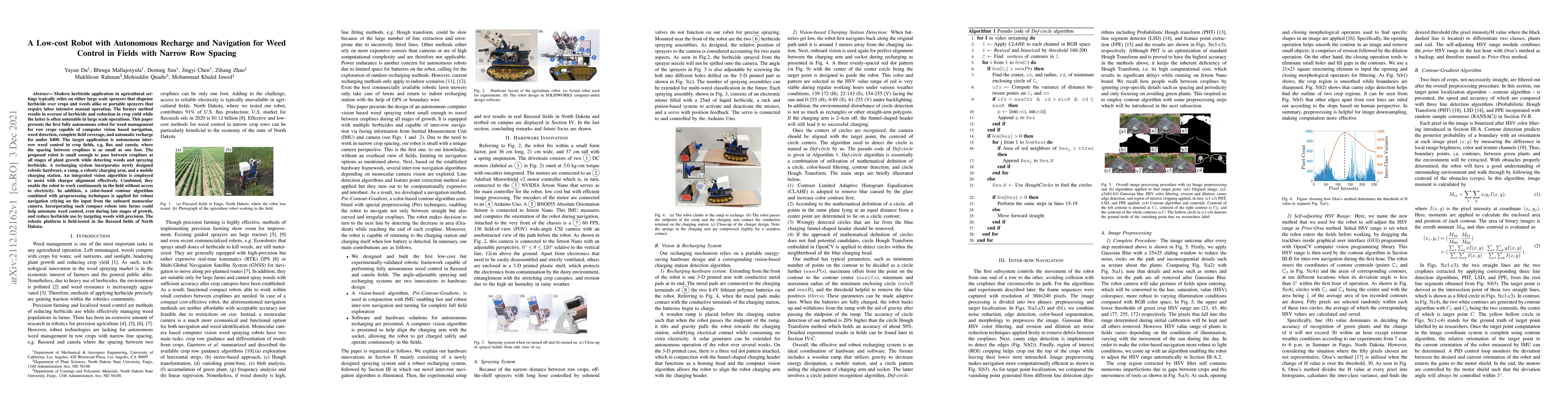 Modern herbicide application in agricultural settings typically relies on either large scale sprayers that dispense herbicide over crops and weeds alike or portable sprayers that require labor intensive manual operation. The former method results in overuse of herbicide and reduction in crop yield while the latter is often untenable in large scale operations. This paper presents the first fully autonomous robot for weed management for row crops capable of computer vision based navigation, weed detection, complete field coverage, and automatic recharge for under \$400. The target application is autonomous inter-row weed control in crop fields, e.g. flax and canola, where the spacing between croplines is as small as one foot. The proposed robot is small enough to pass between croplines at all stages of plant growth while detecting weeds and spraying herbicide. A recharging system incorporates newly designed robotic hardware, a ramp, a robotic charging arm, and a mobile charging station. An integrated vision algorithm is employed to assist with charger alignment effectively. Combined, they enable the robot to work continuously in the field without access to electricity. In addition, a color-based contour algorithm combined with preprocessing techniques is applied for robust navigation relying on the input from the onboard monocular camera. Incorporating such compact robots into farms could help automate weed control, even during late stages of growth, and reduce herbicide use by targeting weeds with precision. The robotic platform is field-tested in the flaxseed fields of North Dakota.