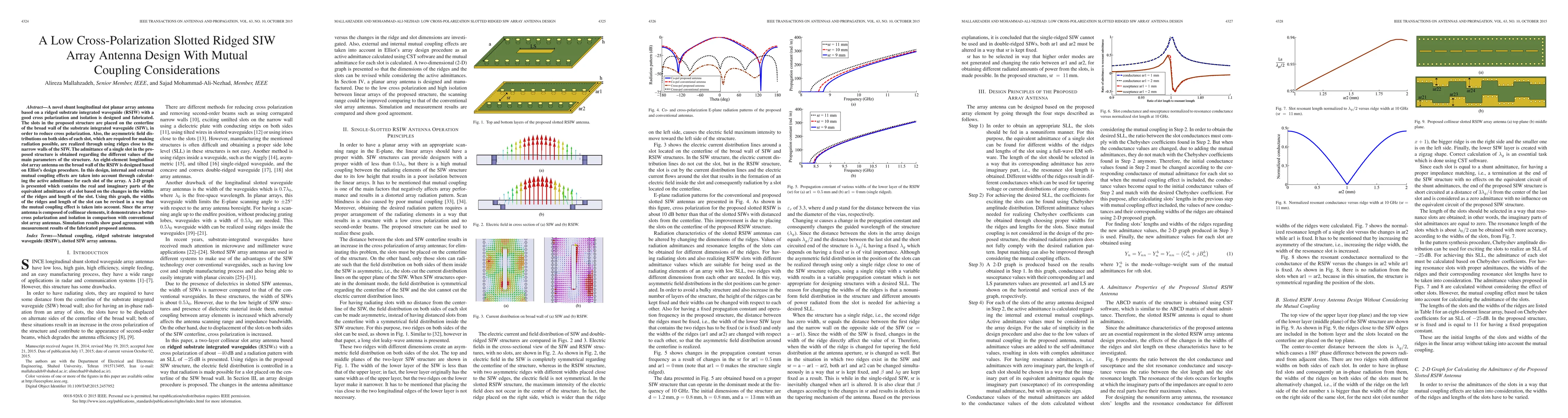 This paper presents a novel low cross-polarization slotted ridged SIW array antenna design that considers mutual coupling effects. The design achieves improved isolation and reduced cross polarization through strategic slot placement and ridge configuration, validated by simulation and measurement results.