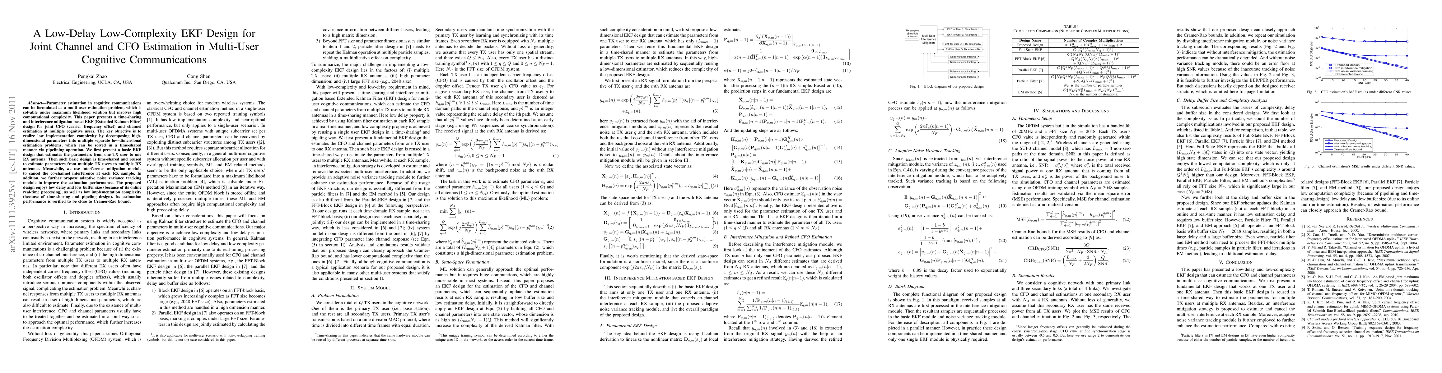 A low-delay, low-complexity EKF design is proposed for joint CFO and channel estimation in multi-user cognitive communications, using time-sharing and interference mitigation to achieve online real-time processing with improved performance.
