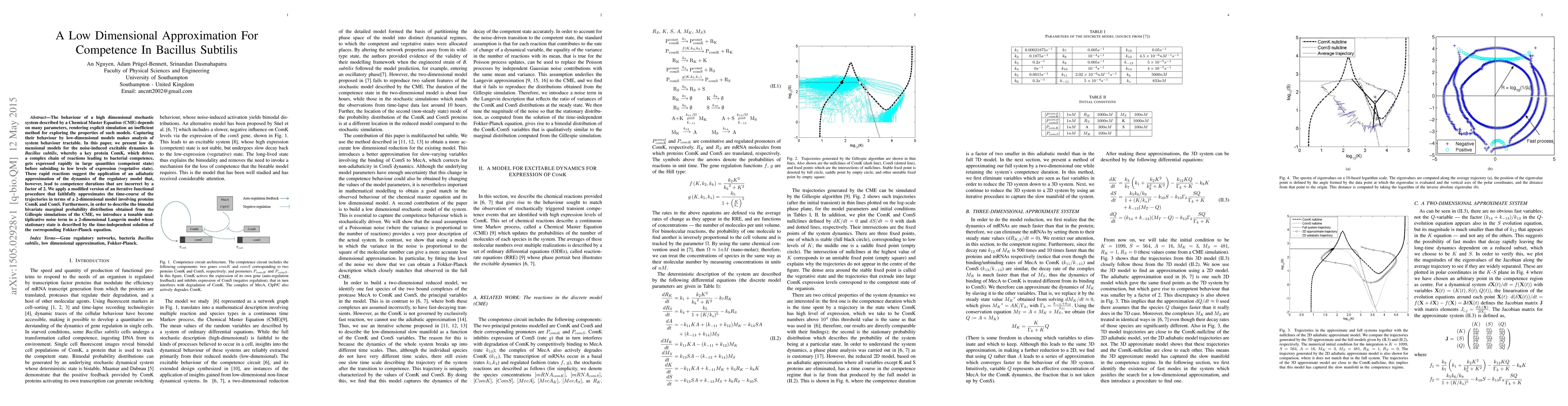 The behaviour of a high dimensional stochastic system described by a Chemical Master Equation (CME) depends on many parameters, rendering explicit simulation an inefficient method for exploring the properties of such models. Capturing their behaviour by low-dimensional models makes analysis of system behaviour tractable. In this paper, we present low dimensional models for the noise-induced excitable dynamics in Bacillus subtilis, whereby a key protein ComK, which drives a complex chain of reactions leading to bacterial competence, gets expressed rapidly in large quantities (competent state) before subsiding to low levels of expression (vegetative state). These rapid reactions suggest the application of an adiabatic approximation of the dynamics of the regulatory model that, however, lead to competence durations that are incorrect by a factor of 2. We apply a modified version of an iterative functional procedure that faithfully approximates the time-course of the trajectories in terms of a 2-dimensional model involving proteins ComK and ComS. Furthermore, in order to describe the bimodal bivariate marginal probability distribution obtained from the Gillespie simulations of the CME, we introduce a tunable multiplicative noise term in a 2-dimensional Langevin model whose stationary state is described by the time-independent solution of the corresponding Fokker-Planck equation.