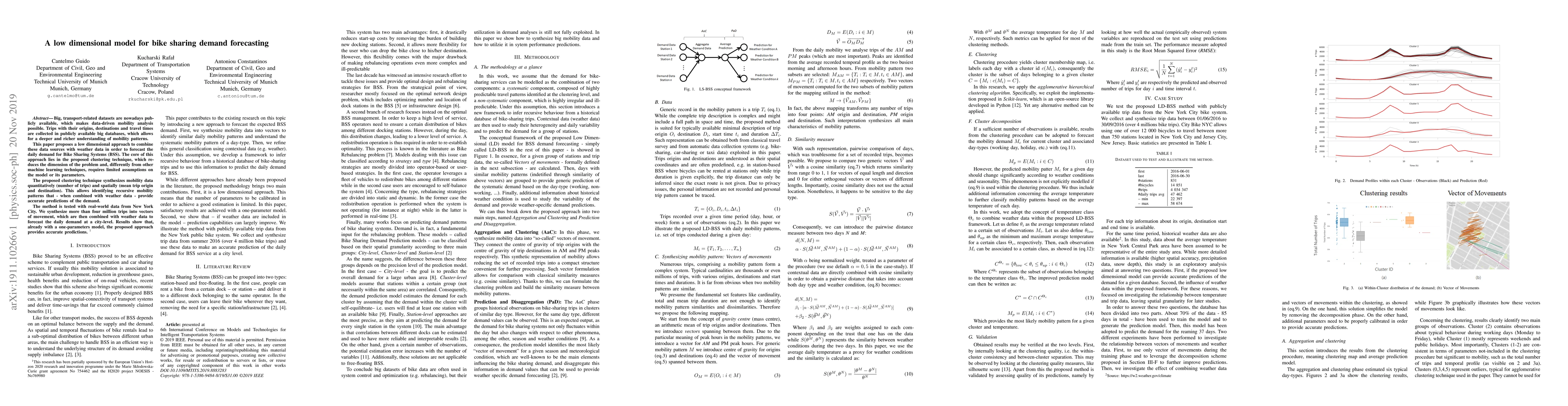 Big, transport-related datasets are nowadays publicly available, which makes data-driven mobility analysis possible. Trips with their origins, destinations and travel times are collected in publicly available big databases, which allows for a deeper and richer understanding of mobility patterns. This paper proposes a low dimensional approach to combine these data sources with weather data in order to forecast the daily demand for Bike Sharing Systems (BSS). The core of this approach lies in the proposed clustering technique, which reduces the dimension of the problem and, differently from other machine learning techniques, requires limited assumptions on the model or its parameters. The proposed clustering technique synthesizes mobility data quantitatively (number of trips) and spatially (mean trip origin and destination). This allows identifying recursive mobility patterns that - when combined with weather data - provide accurate predictions of the demand. The method is tested with real-world data from New York City. We synthesize more than four million trips into vectors of movement, which are then combined with weather data to forecast the daily demand at a city-level. Results show that, already with a one-parameters model, the proposed approach provides accurate predictions.