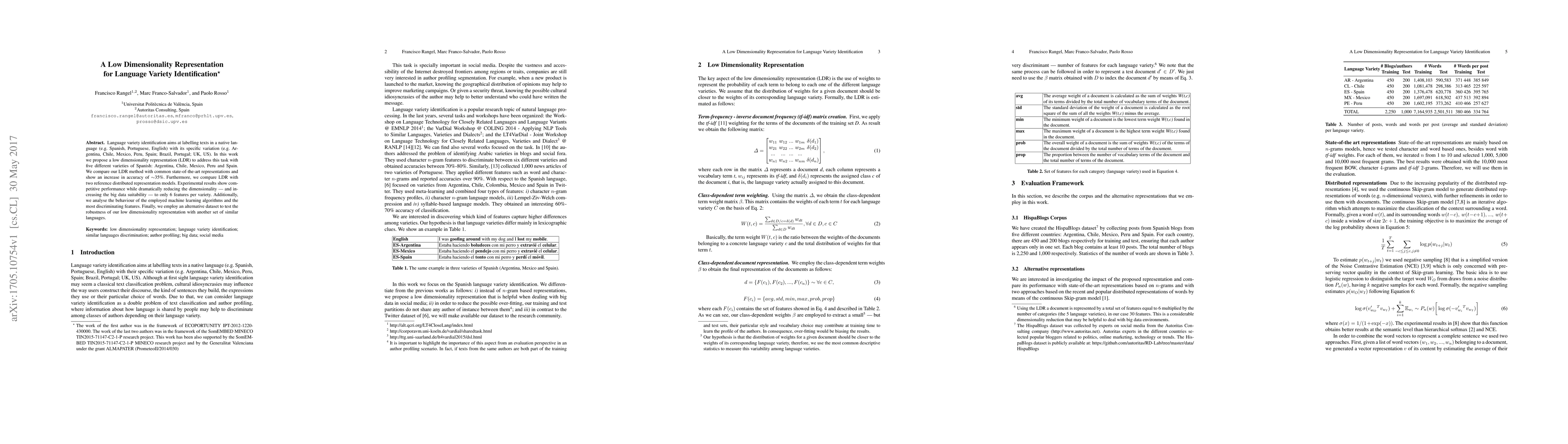 The research proposes a low dimensionality representation (LDR) for language variety identification, focusing on five varieties of Spanish: Argentina, Chile, Mexico, Peru, and Spain. The LDR method is compared with common state-of-the-art representations and two distributed representation models, demonstrating improved accuracy (~35%) and reduced dimensionality to only 6 features per variety.