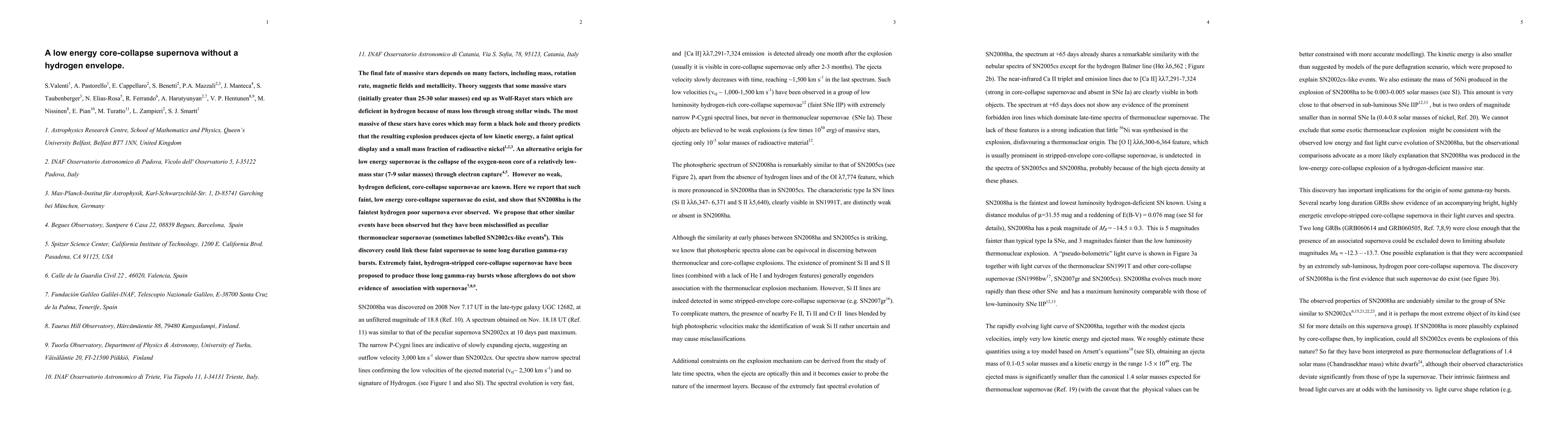 This paper reports the discovery of a faint, low energy core-collapse supernova, SN2008ha, which lacks a hydrogen envelope and suggests it may be linked to long duration gamma-ray bursts. The findings propose that previously misclassified thermonuclear supernovae could actually be similar low energy core-collapse events.