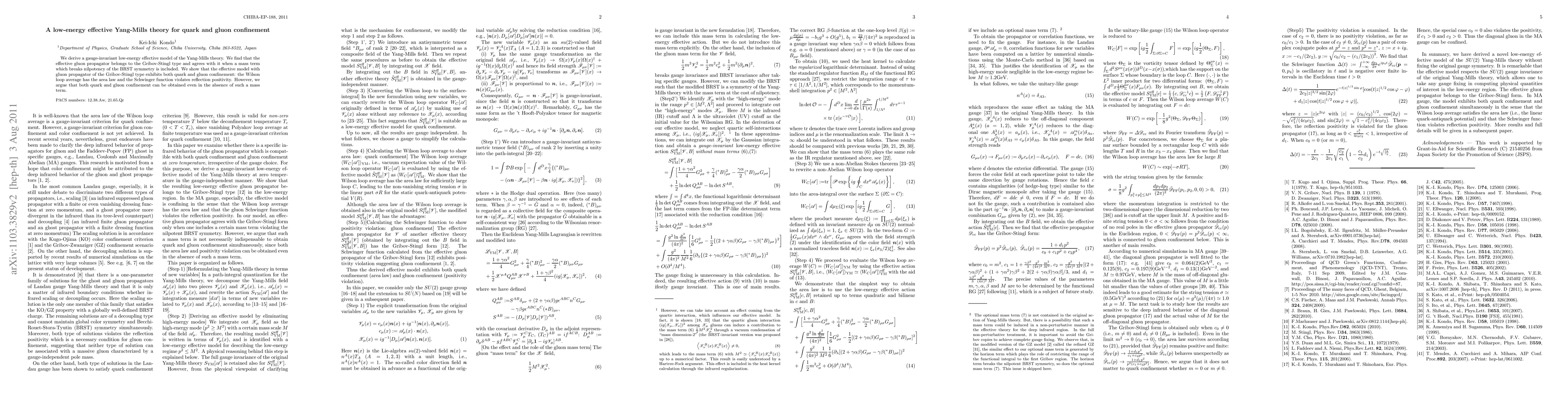 This research develops a low-energy effective Yang-Mills theory for quark and gluon confinement, deriving a gauge-invariant model with a Gribov-Stingl type gluon propagator that agrees with confinement properties. It argues that both quark and gluon confinement can occur regardless of a specific mass term.