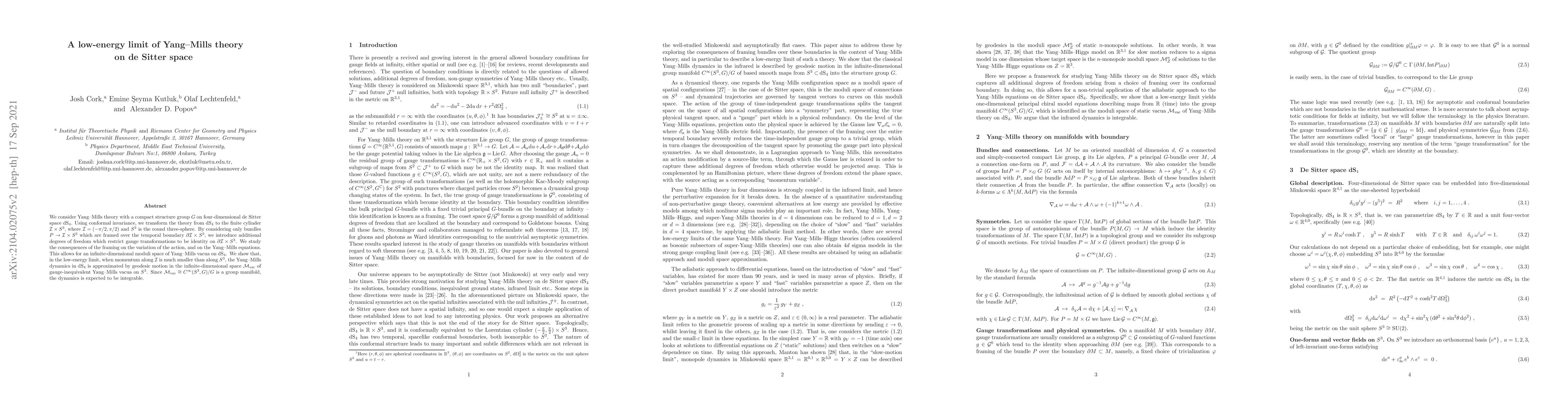We consider Yang--Mills theory with a compact structure group $G$ on four-dimensional de Sitter space dS$_4$. Using conformal invariance, we transform the theory from dS$_4$ to the finite cylinder ${\cal I}\times S^3$, where ${\cal I}=(-\pi/2, \pi/2)$ and $S^3$ is the round three-sphere. By considering only bundles $P\to{\cal I}\times S^3$ which are framed over the temporal boundary $\partial{\cal I}\times S^3$, we introduce additional degrees of freedom which restrict gauge transformations to be identity on $\partial{\cal I}\times S^3$. We study the consequences of the framing on the variation of the action, and on the Yang--Mills equations. This allows for an infinite-dimensional moduli space of Yang--Mills vacua on dS$_4$. We show that, in the low-energy limit, when momentum along ${\cal I}$ is much smaller than along $S^3$, the Yang--Mills dynamics in dS$_4$ is approximated by geodesic motion in the infinite-dimensional space ${\cal M}_{\rm vac}$ of gauge-inequivalent Yang--Mills vacua on $S^3$. Since ${\cal M}_{\rm vac}\cong C^\infty (S^3, G)/G$ is a group manifold, the dynamics is expected to be integrable.