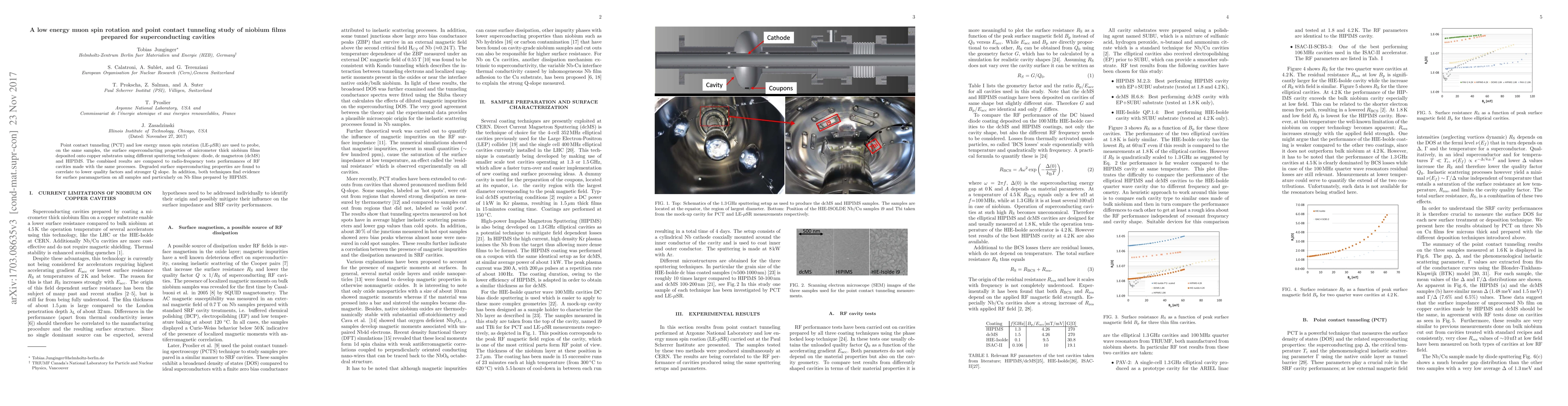 Point contact tunneling (PCT) and low energy muon spin rotation (LE-muSR) are used to probe, on the same samples, the surface superconducting properties of micrometer thick niobium films deposited onto copper substrates using different sputtereing techniques: diode, dc magnetron (dcMS) and HIPIMS. The combined results are compared to radio-frequency tests performances of RF cavities made with the same processes. Degraded surface superconducting properties are found to yield lower quality factors and stronger Q slope. In addition, both techniques find evidence for surface paramagnetism on all samples and particularly on Nb films prepared by HIPIMS.