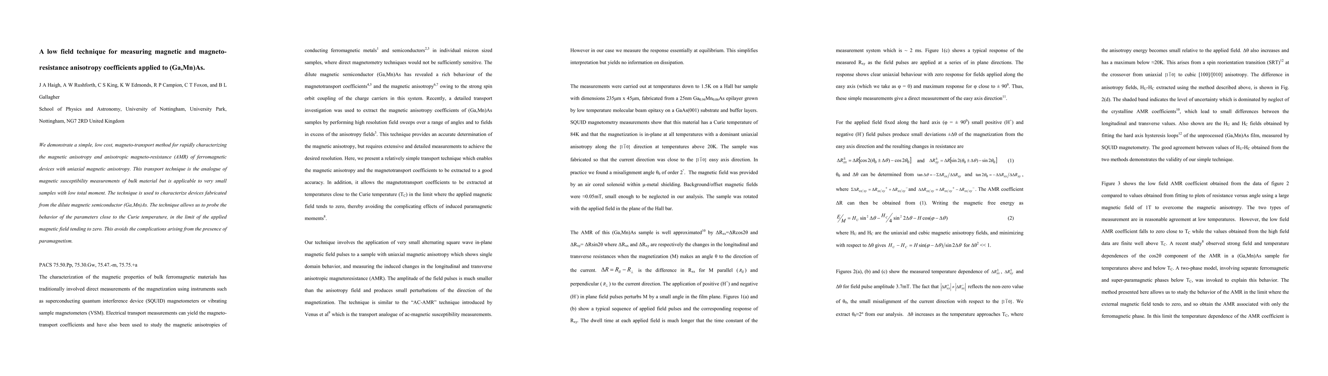 This paper presents a cost-effective magneto-transport method for measuring magnetic anisotropy and anisotropic magneto-resistance in ferromagnetic materials, specifically applied to (Ga,Mn)As. The technique allows for characterization of parameters near the Curie temperature without complications from paramagnetism.