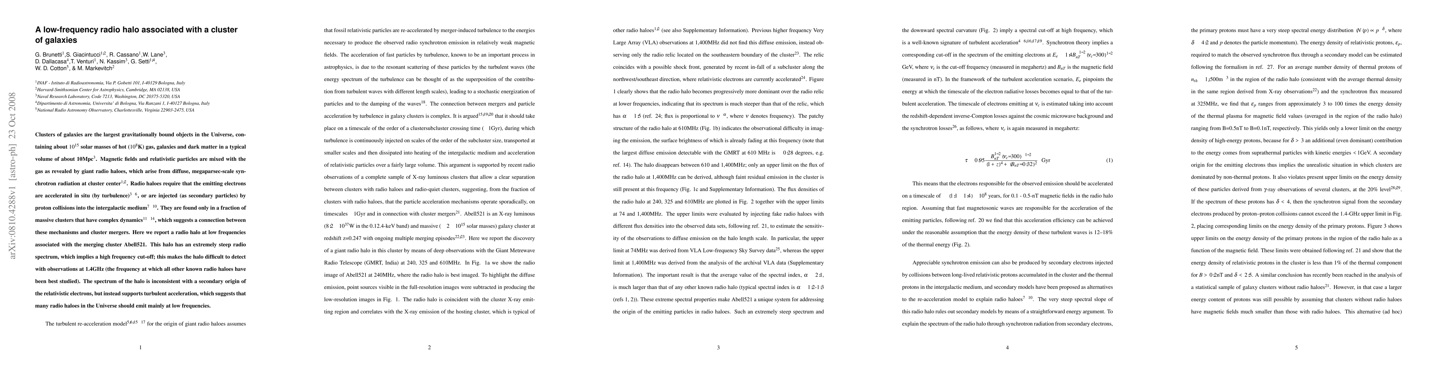 Clusters of galaxies are the largest gravitationally bound objects in the Universe, containing about 10^15 solar masses of hot (10^8 K) gas, galaxies and dark matter in a typical volume of about 10 Mpc^3. Magnetic fields and relativistic particles are mixed with the gas as revealed by giant radio haloes, which arise from diffuse, megaparsec-scale synchrotron radiation at cluster center. Radio haloes require that the emitting electrons are accelerated in situ (by turbulence), or are injected (as secondary particles) by proton collisions into the intergalactic medium. They are found only in a fraction of massive clusters that have complex dynamics, which suggests a connection between these mechanisms and cluster mergers. Here we report a radio halo at low frequencies associated with the merging cluster Abell 521. This halo has an extremely steep radio spectrum, which implies a high frequency cut-off; this makes the halo difficult to detect with observations at 1.4 GHz (the frequency at which all other known radio haloes have been best studied). The spectrum of the halo is inconsistent with a secondary origin of the relativistic electrons, but instead supports turbulent acceleration, which suggests that many radio haloes in the Universe should emit mainly at low frequencies.