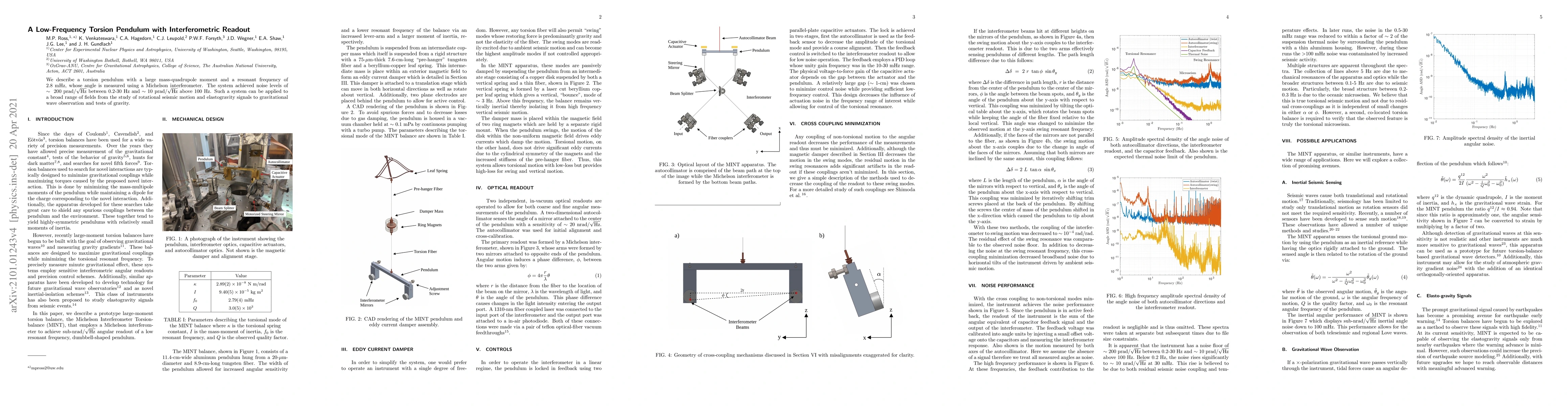 A torsion pendulum with a low-frequency resonant frequency was developed using a modified Michelson interferometer, achieving noise levels of 200 prad/sqrt(Hz) between 0.2-30 Hz.